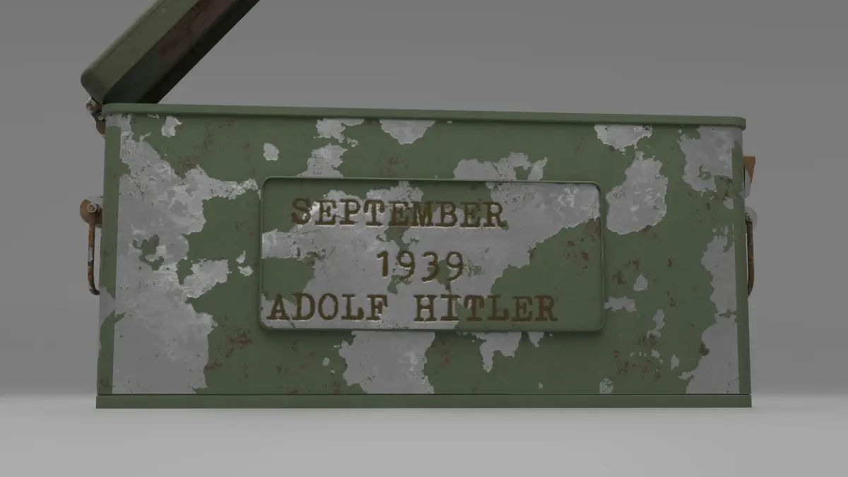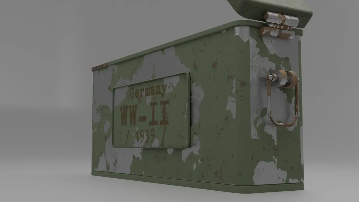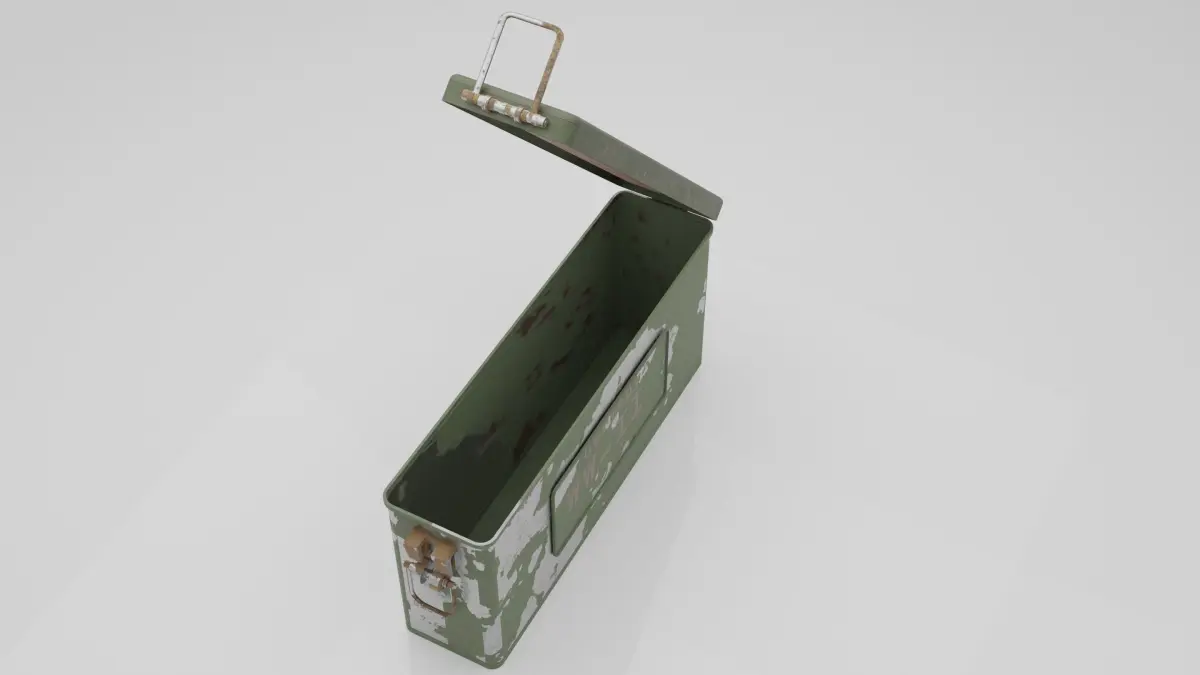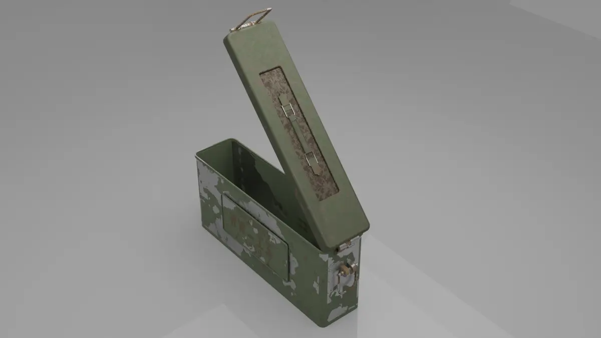 The exterior of the ammo box is typically constructed from sturdy metal or durable plastic. It features a rectangular shape with reinforced corners and edges. The surface might have weathering, scratches, and other realistic textures to add authenticity.The lid of the ammo box is depicted in an open position, revealing the contents inside. The hinges connecting the lid to the main body are often visible and accurately represented. The hinges allow the lid to swing open smoothly.The exterior of the ammo box might have labels, markings, and stenciled information indicating the type of ammunition, quantity, manufacturer, and any relevant safety warnings. These details contribute to the realism of the model.