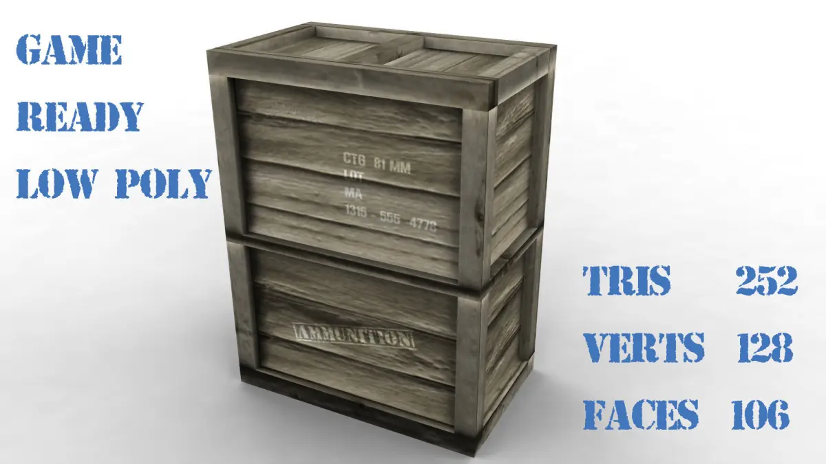 low poly vertcal box ammunition, ready to game, included formats:fbx,objmb, psd layered to change the text,normal mapspecular mapdiffuse map