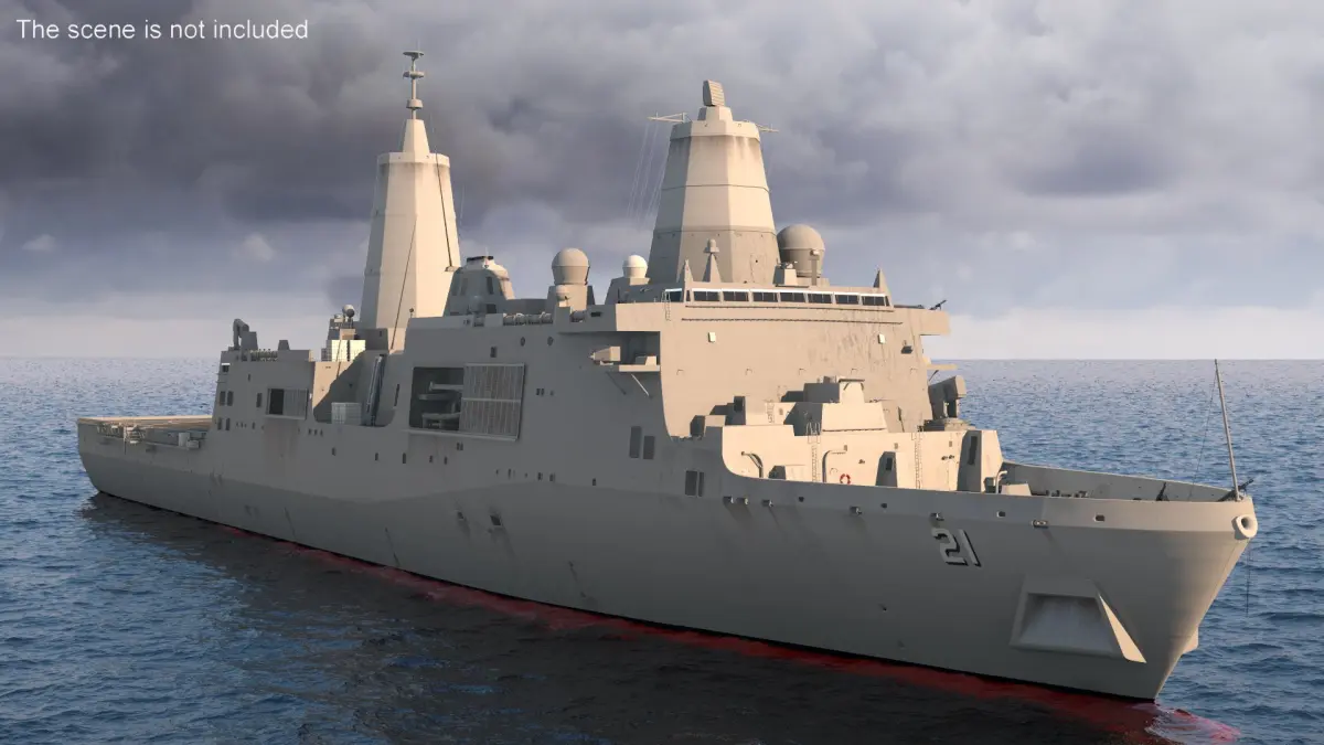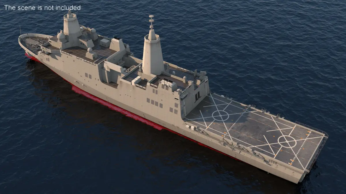 Amphibious Transport Dock Ship USS Portland LPD 27 is a high quality, photo real 3d model that will enhance detail and realism to any of your rendering projects. The model has a fully textured, detailed design that allows for close-up renders, and was originally modeled in 3ds Max 2020 and rendered with V-Ray. Renders have no postprocessing!