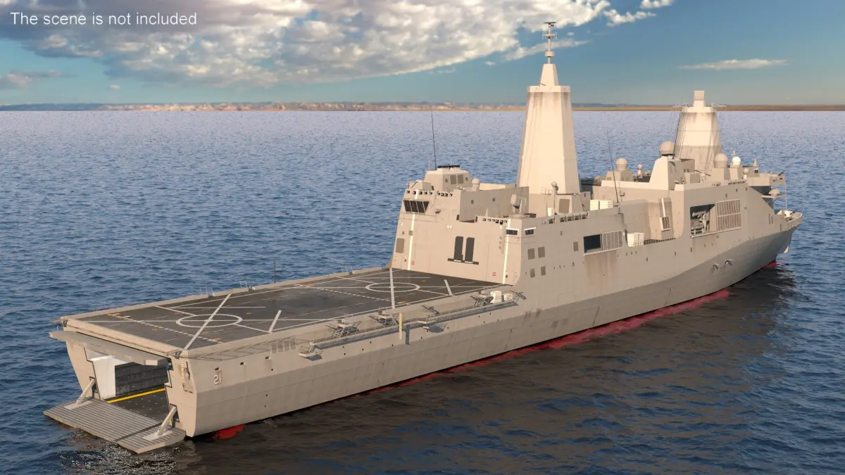 Amphibious Transport Dock Ship USS Portland LPD 27 is a three-dimensional model of a modern naval vessel known as an amphibious transport dock (LPD), specifically designed for deploying and supporting ground forces via water.