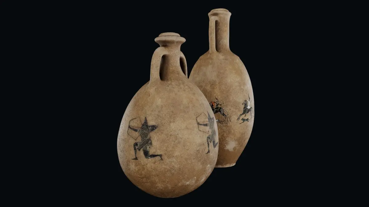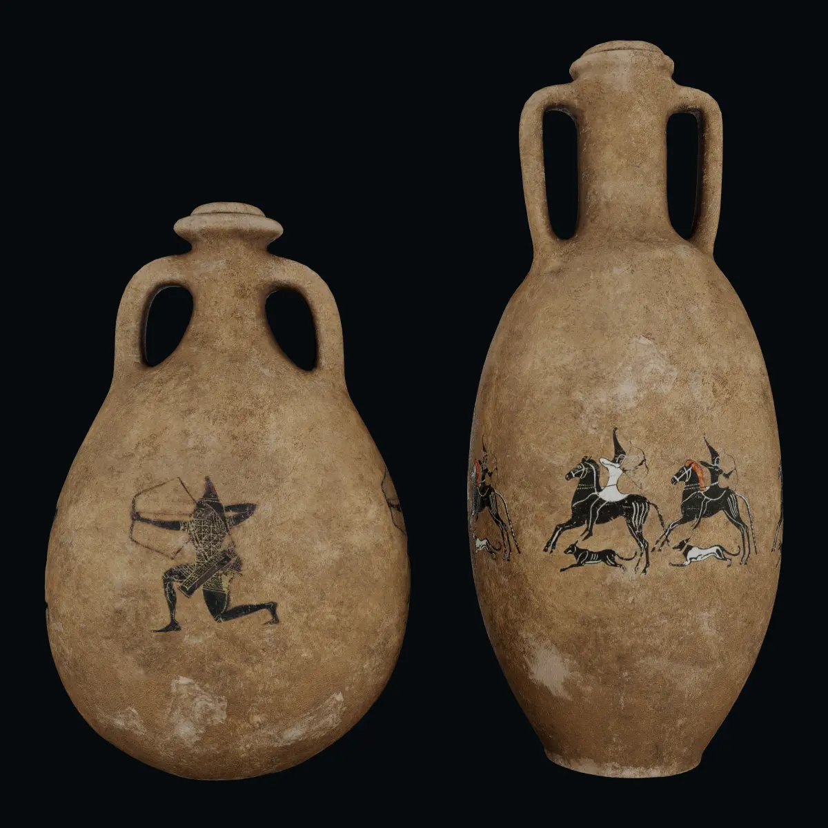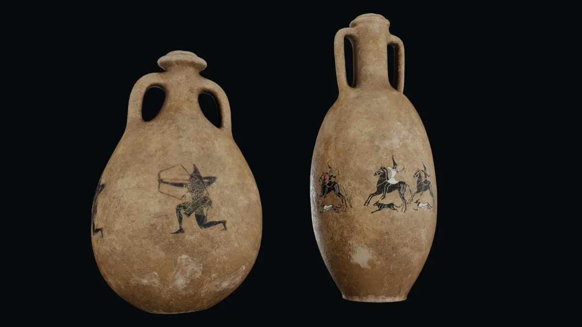 Two Amphora models with historical painted figures on them. Amphora 1 has a figure which is a depiction of Cimmerian mounted archers from a Greek vase.Amphora 2 has a figure which is a Scythian archer with pointed cap, François Vase (black-figure volute krater), 570 BC Archaic Greek, by Clitias and Ergotimos from Fonte Rotella, Chiusi, Italy.