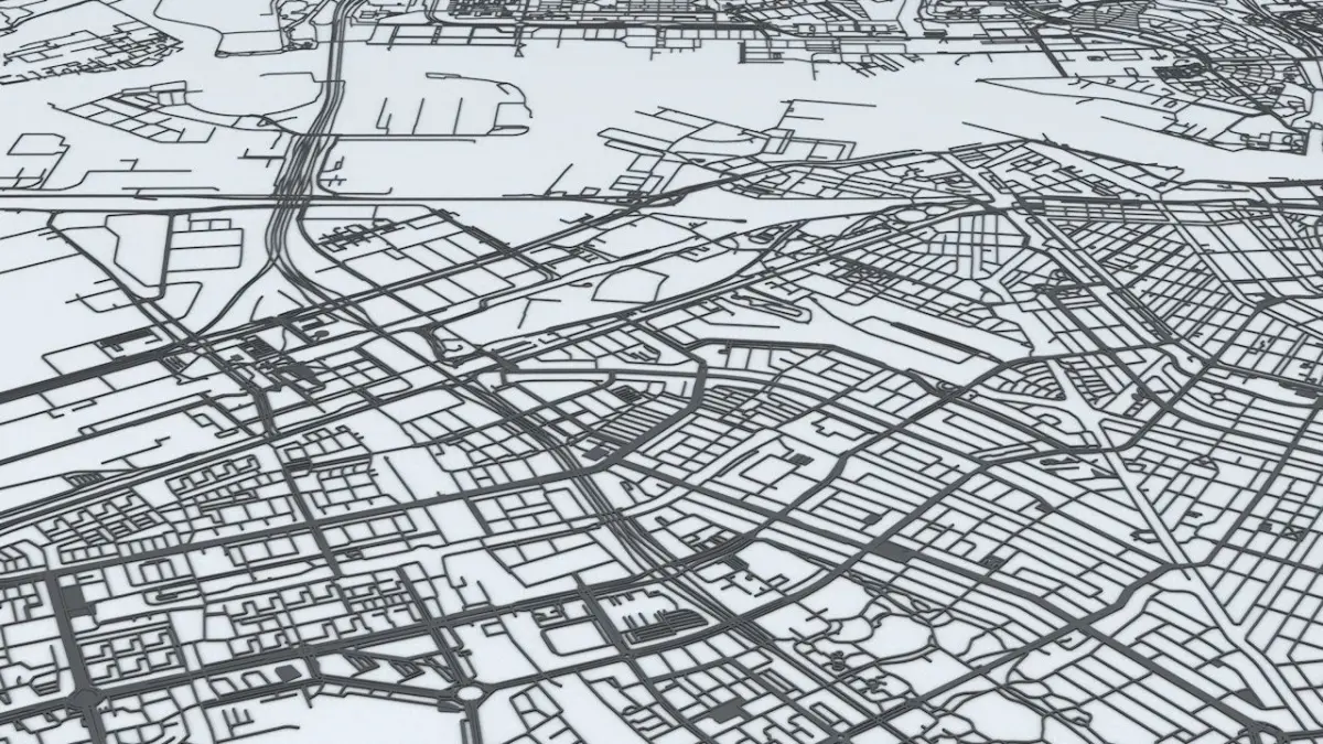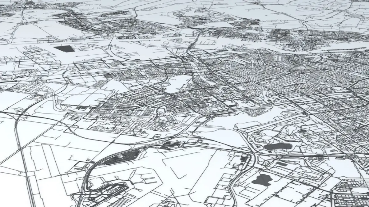 - the model is positioned on a flat surface (road network is on the “floor” - no elevation data included)