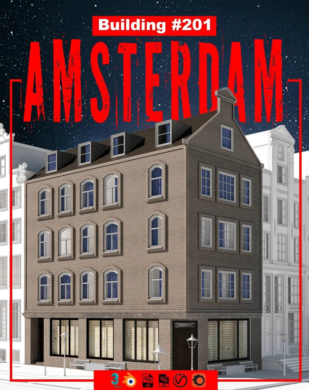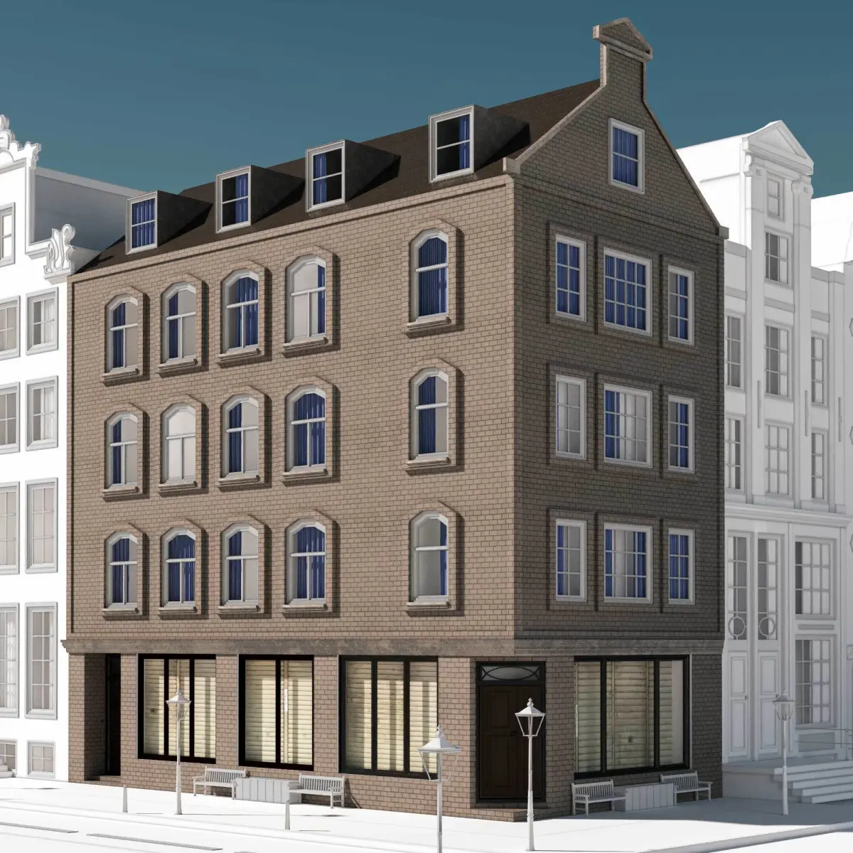The 3D model of a typical building in Amsterdam city accurate representation of the unique architecture found in this vibrant city. Overall, this 3D model is an asset that is sure to add realism and authenticity to any project. The building itself features a traditional Dutch design with a narrow profile, gabled roof, and ornate brickwork. The facade is adorned with large windows and decorative elements. Whether you're creating a virtual cityscape or designing a real-world building, this model is a choice that we hope will help you achieve your goals with ease.