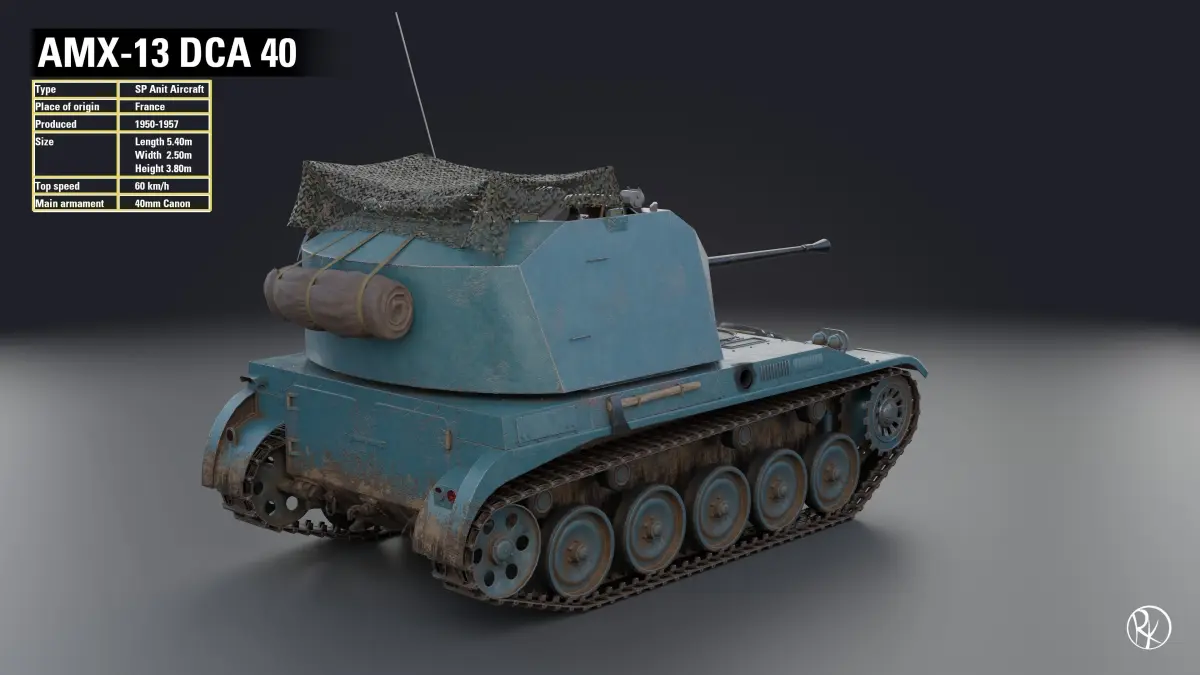The AMX-13 DCA 40 is based on the AMX-13 chassis but used an alternative turret equipped with a 40mm Bofors L/70 gun to effectively engage airborne targets.The concepting began in 1950 with the goal of replacing the existing obsolete SPAA vehicles from WW2. Although no vehicles were ever put in service, the experience gathered from the development of the AMX-13 DCA 40 helped in the future development and production of the AMX-13 DCA.