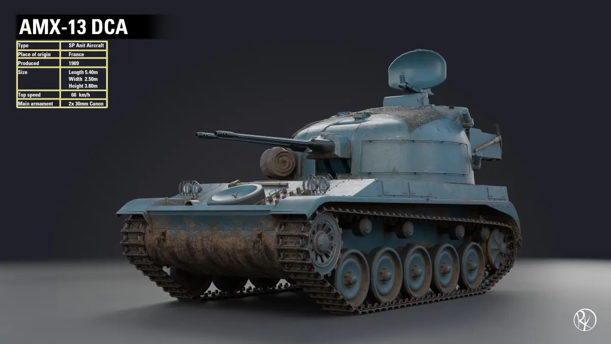 The AMX-13 DCA is based on the AMX-13 chassis but used an alternative turret equipped with 2 30mm autocannons and a radar sensor to effectively engage airborne targets.With production starting in 1969, around 60 vehicles were produced, however, the AMX-13 DCA was never used in combat, and is no longer in active use.