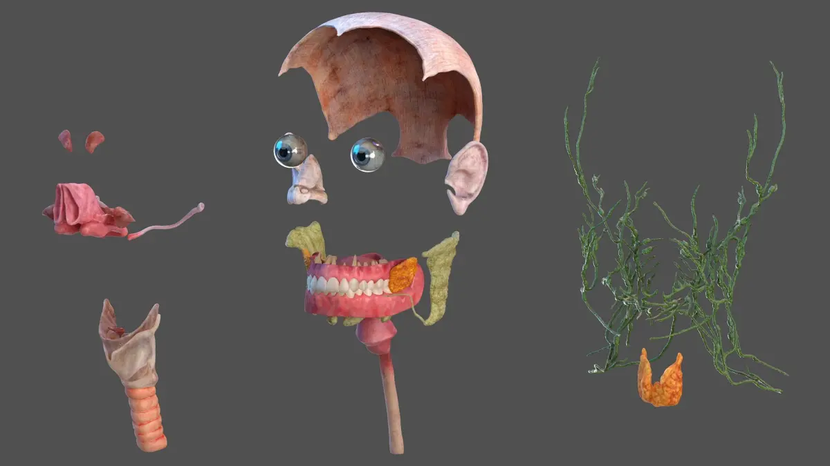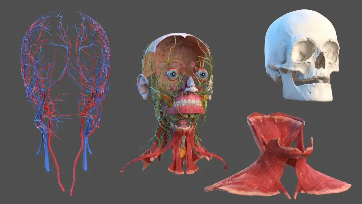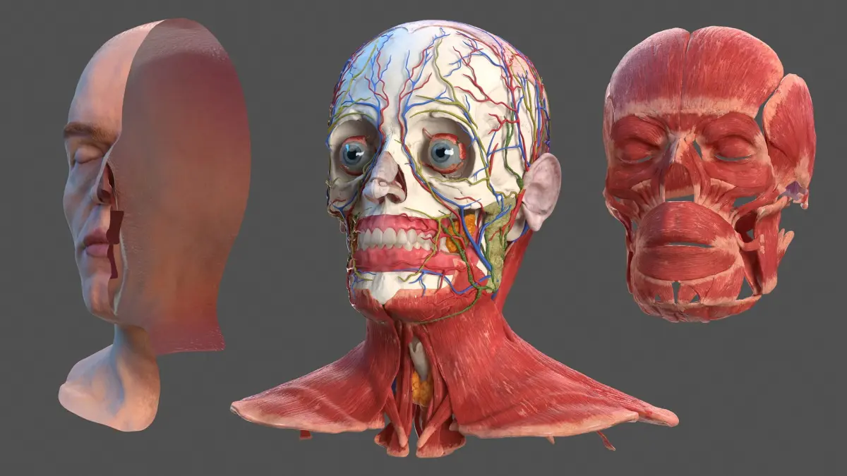 Skin and skinless divided anatomy model of human head with scull muscles and neck muscles.