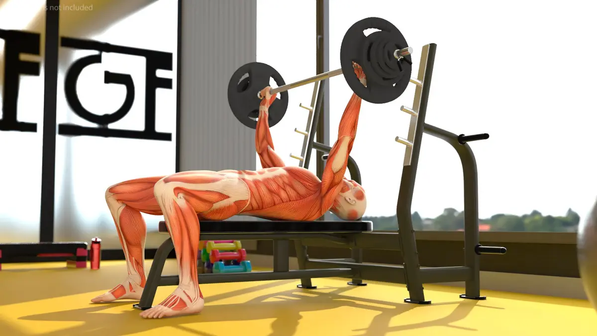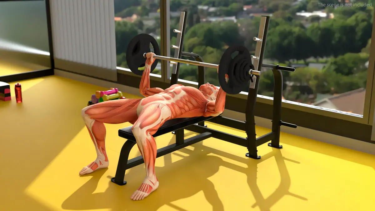 This model illustrates a lifter on a weight bench, grasping a barbell with accurate anatomical details of the muscles engaged in the exercise. The depiction highlights muscles such as the pectorals, deltoids, triceps, and supporting muscle groups, providing a clear understanding of body mechanics during a bench press.