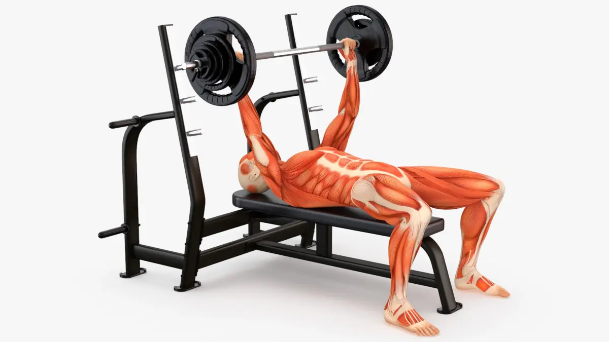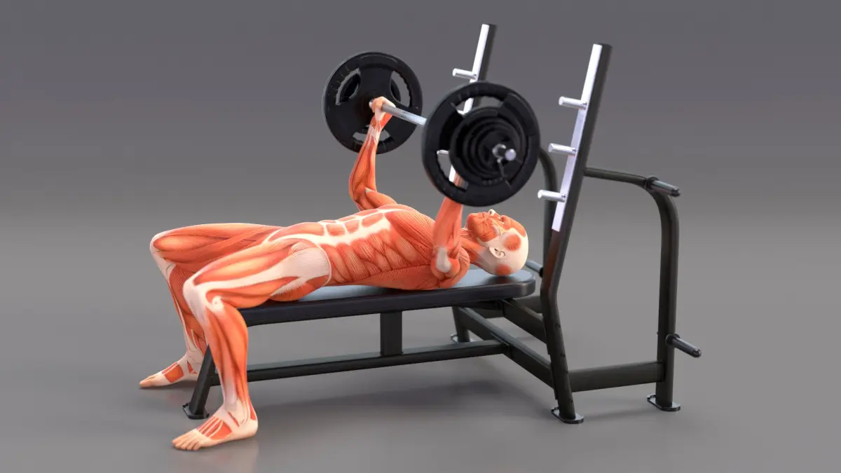 This model illustrates a lifter on a weight bench, grasping a barbell with accurate anatomical details of the muscles engaged in the exercise. The depiction highlights muscles such as the pectorals, deltoids, triceps, and supporting muscle groups, providing a clear understanding of body mechanics during a bench press.