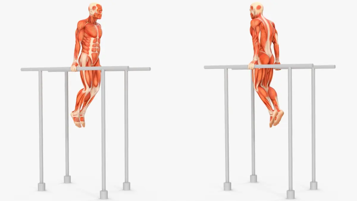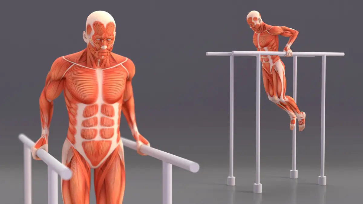 Anatomy Male Muscular System Chest Dip Animated Rigged for Cinema 4D is a three-dimensional model of a musculature depiction performing a dip exercise on parallel bars, showcasing detailed anatomy involved in this movement.
