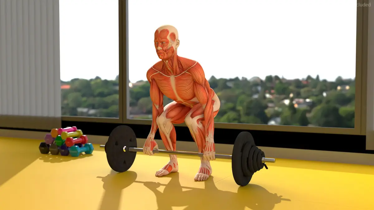 Anatomy Male Muscular System Deadlift Animated Rigged is a 3d model of a human performing a deadlift exercise, showcasing detailed muscular anatomy.