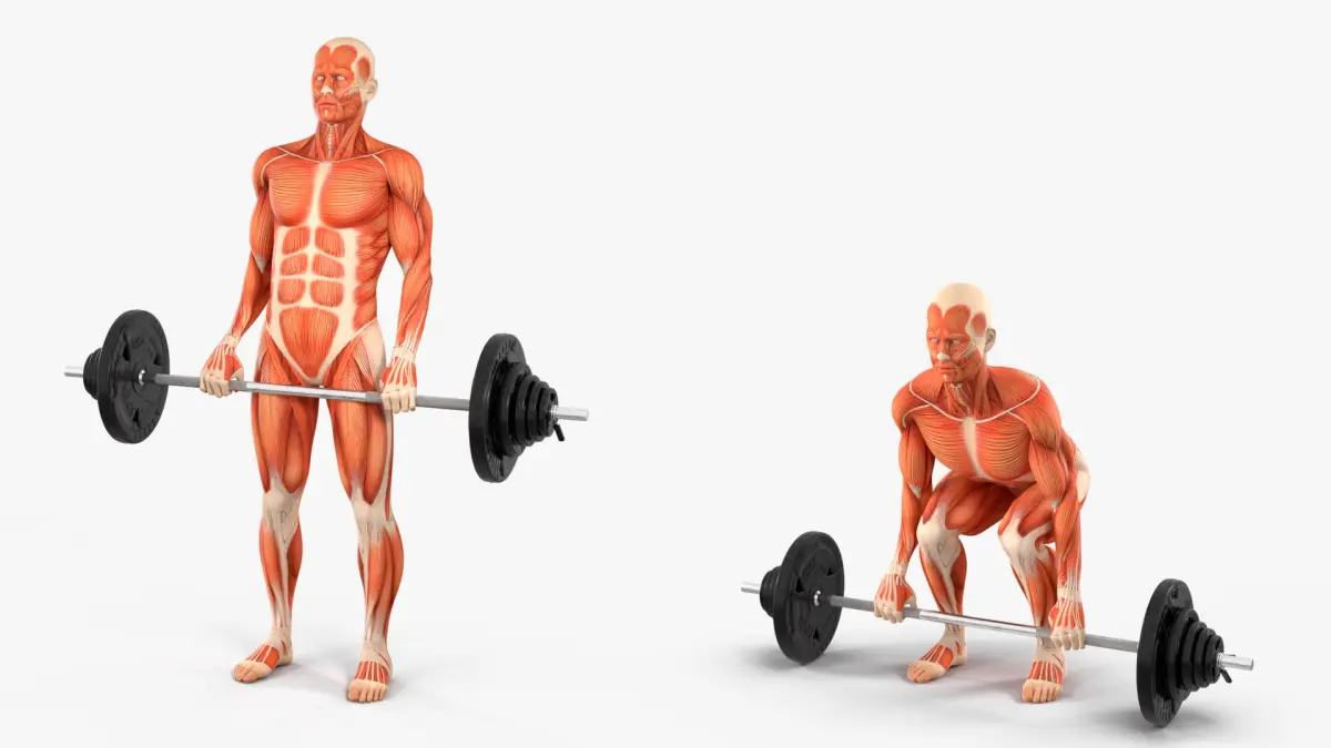 This model highlights the muscular structure engaged during a deadlift, including major muscle groups such as the quadriceps, hamstrings, glutes, and back muscles. It provides an in-depth view of the musculoskeletal system, aiding in the understanding of muscle engagement and biomechanics during weightlifting.
