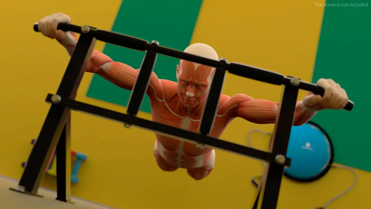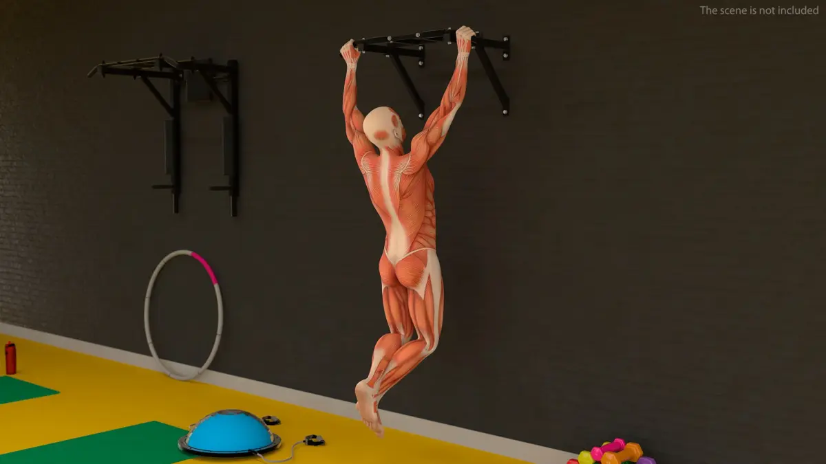 Anatomy Male Muscular System Pull-up Animated Rigged is a three-dimensional model of a human figure performing a pull-up, showcasing detailed muscle anatomy.