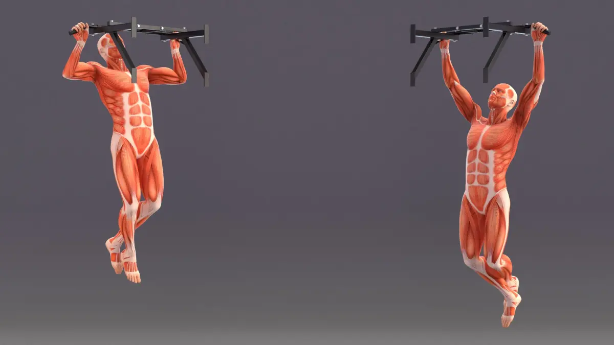 The model highlights the muscular structure involved in a pull-up exercise, displaying prominent muscle groups such as the latissimus dorsi, biceps, and deltoids. It provides a comprehensive view of how these muscles engage during the exercise, enhancing understanding of physical biomechanics and movement dynamics.