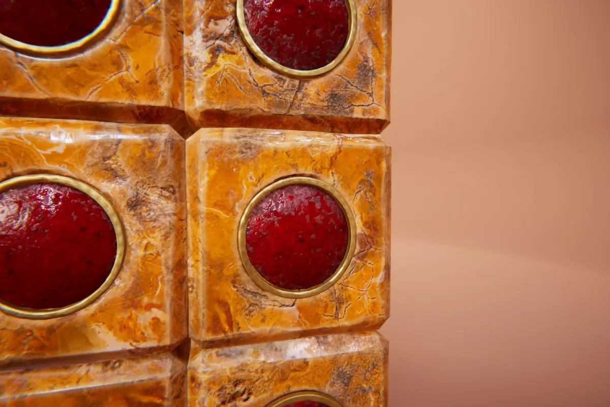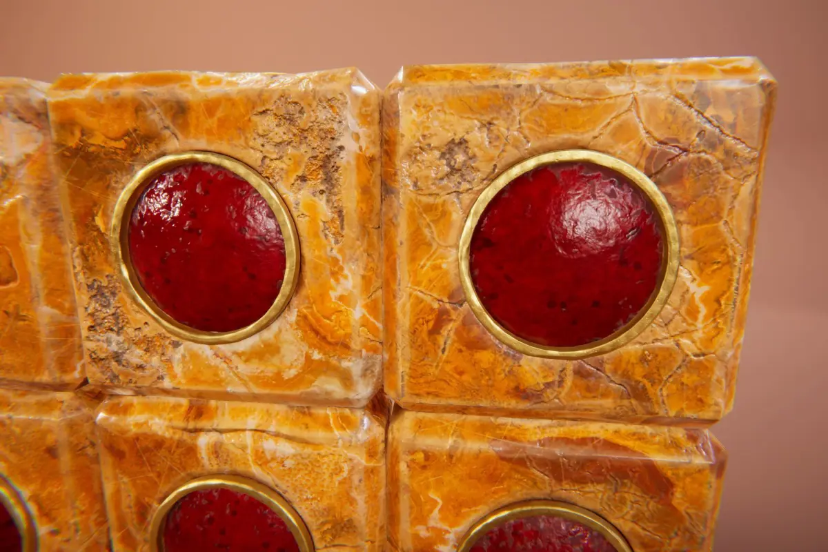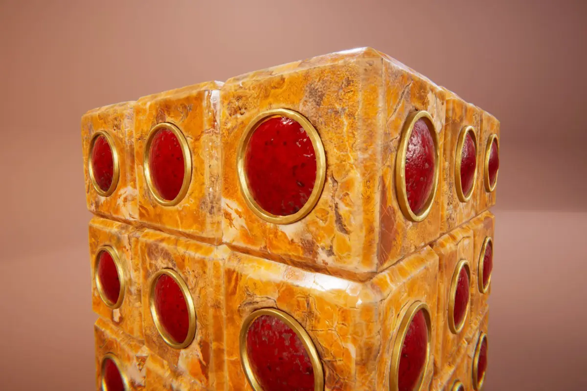 Composed of individually sculpted marble blocks, this unique structure features deep-red gemstones set into gold ring inlays, embedded symmetrically across each face. The polished stone reflects age and refinement, while the precision-cut gems lend a magical or ceremonial touch - ideal for ancient puzzles, magical seals, or arcane mechanisms. Intricate surface cracks, chipped edges, and layered materials add visual depth and realism, making this asset perfect for fantasy temples, lost civilizations, or relic chambers.