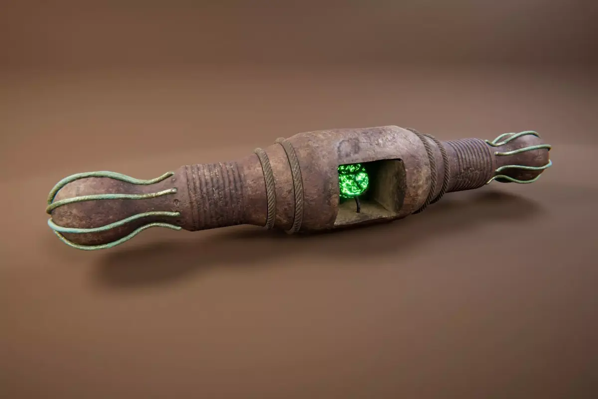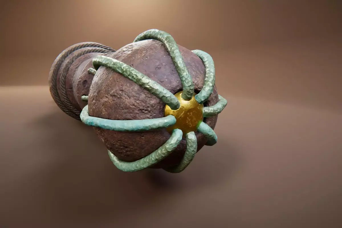 This collection features five distinct mystical artifacts, each crafted with unique materials and storytelling potential. From the ancient Bone Horn bound in rusted copper chain and sealed with a glowing amethyst, to the mysterious Ritual Core encased in stone with an eerie green energy source, each prop is designed to evoke wonder and unease. A spherical Relic Orb combines cracked marble with sharp green crystal spikes, while the Arcane Mosaic Tome impresses with a hinged stone frame, gold-capped finials, and stained-glass windows in golden lattice - reminiscent of sacred scriptures or magical tomes. Finally, the Geometric Memory Cube, forged from richly weathered amber stone and set with glowing red gems, adds a touch of ancient computation or locked secrets.