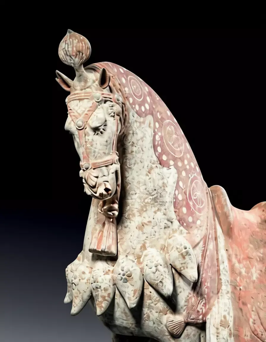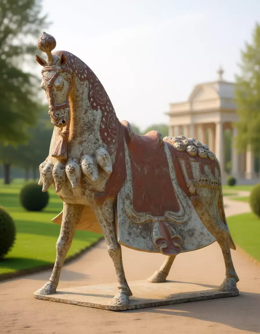 Download the highly detailed 3D model of an ancient Chinese terracotta horse, a faithful digital recreation of a Tang Dynasty equestrian sculpture renowned for its artistic elegance and historical significance. This Tang horse 3D model features a powerful, lifelike stance with a gracefully arched neck, muscular body, and naturalistic proportions that reflect the advanced craftsmanship of imperial China. The horse is adorned with intricate harnesses, decorative saddle blankets, and ornamental trappings in faded red and white pigments — capturing the vibrant colors and symbolic patterns used in funerary art of the era. Ideal for use in museum exhibitions, historical reconstructions, educational content, film production, NFT art, and digital heritage projects, this ancient horse sculpture 3D asset brings cultural depth and archaeological authenticity to any project.