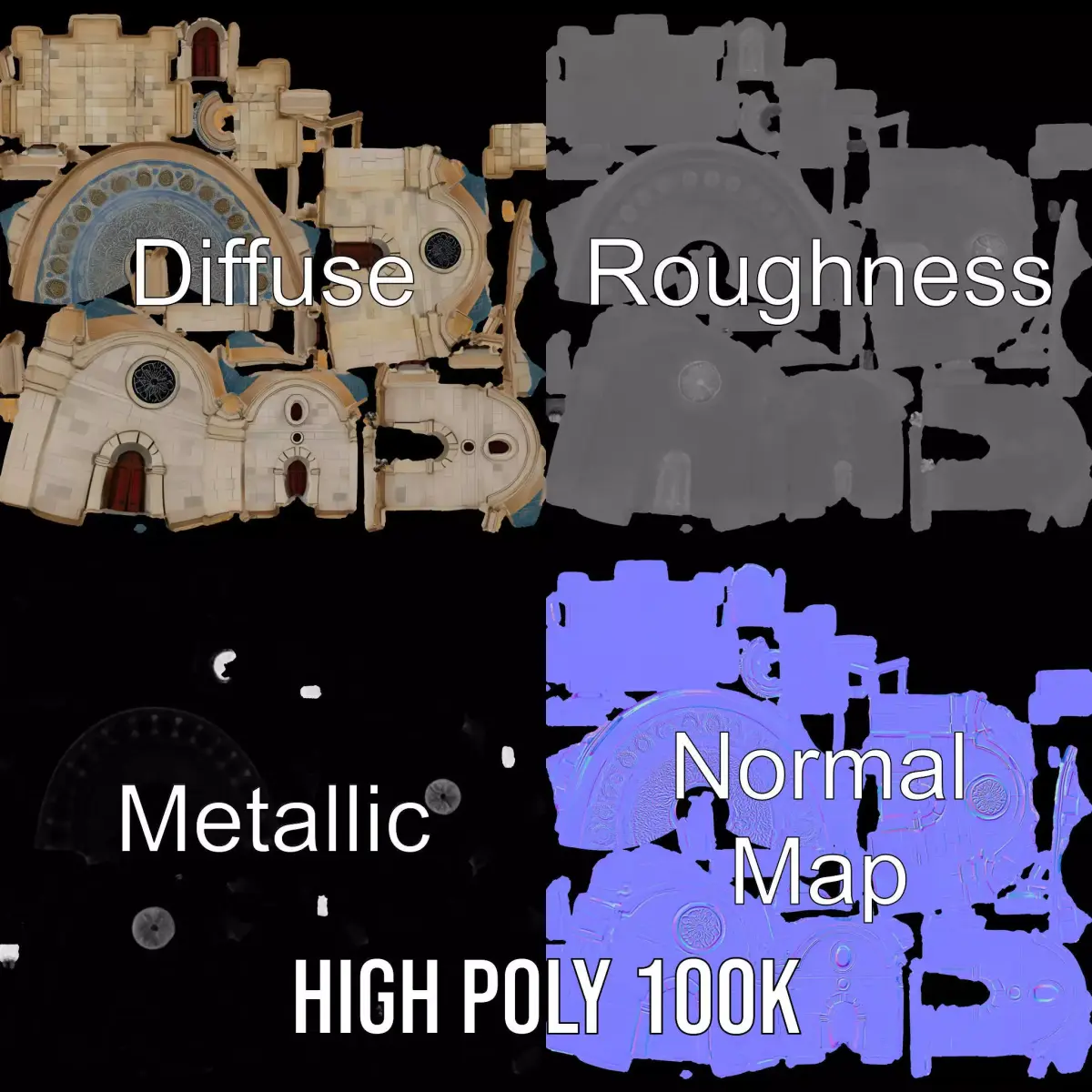 This ancient chapel model showcases intricate stonework and a beautifully detailed dome. Each model has 3 levels of detail: low-poly (1000 triangles for mobile), middle-poly (10,000 triangles for environment), and high-poly (100,000 triangles), which allows for the use of this model in production rendering (such as 3ds Max, Maya, Cinema4D, Blender, Vray/Corona/Cycles and all others), game engines (Unity and Unreal compatible), and interactive presentations, providing a choice of detail based on the LOD system principle. Ideal for games, architectural visualization, and educational simulations. The model's textures are PBR, diffuse, normal map, and reflection/roughness/metallic, which are suitable for any modern rendering engine. All models are accurately unwrapped with no overlapping UVs. All textures are 4096*4096 in size. Please like and leave a comment for the model if you enjoyed it.