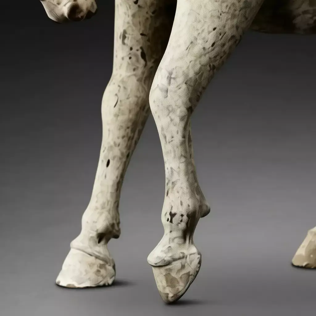 The model includes full PBR material support — albedo, roughness, normal, metallic, and ambient occlusion maps — ensuring realistic lighting behavior and surface response under various conditions. The terracotta texture is rendered with fine detail, including subtle grain patterns, earthy tones, and surface imperfections that enhance realism. The hooves, mane, and ears are modeled with precision, reflecting the attention to anatomical accuracy characteristic of Tang or Qin-era artistry.