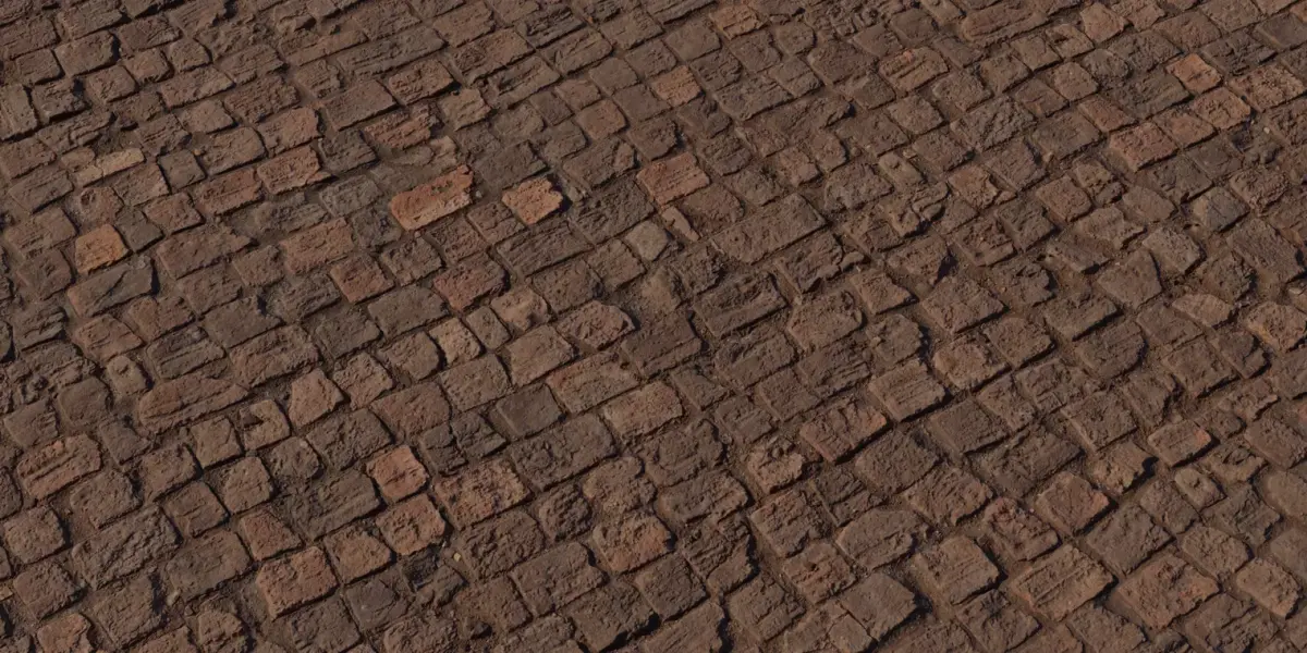 A seamless, photorealistic cobbled clay‑brick ground material featuring irregular hand‑molded bricks, chipped edges, and earth‑filled joints that sell age and foot‑worn realism in games and archviz scenes. Warm terracotta to umber variation reads convincingly in closeups while tiling cleanly across large plazas, alleys, and courtyards without obvious repeats under HDRI or sun rigs. Calibrated PBR maps preserve sharp relief, tool marks, and broken corners for strong parallax and tactile roughness at grazing light angles.
