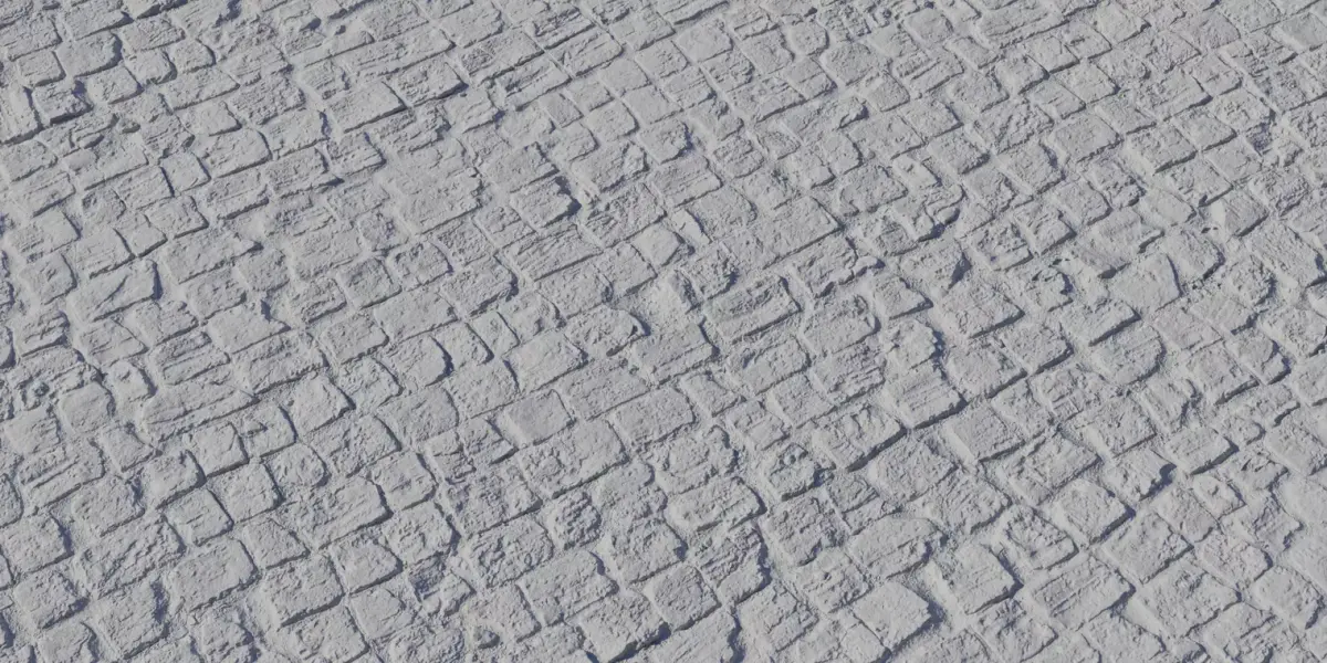 Real‑world scale aligned to small cobbles; height captures deep grout and uneven crowns for convincing tessellation or budget parallax.