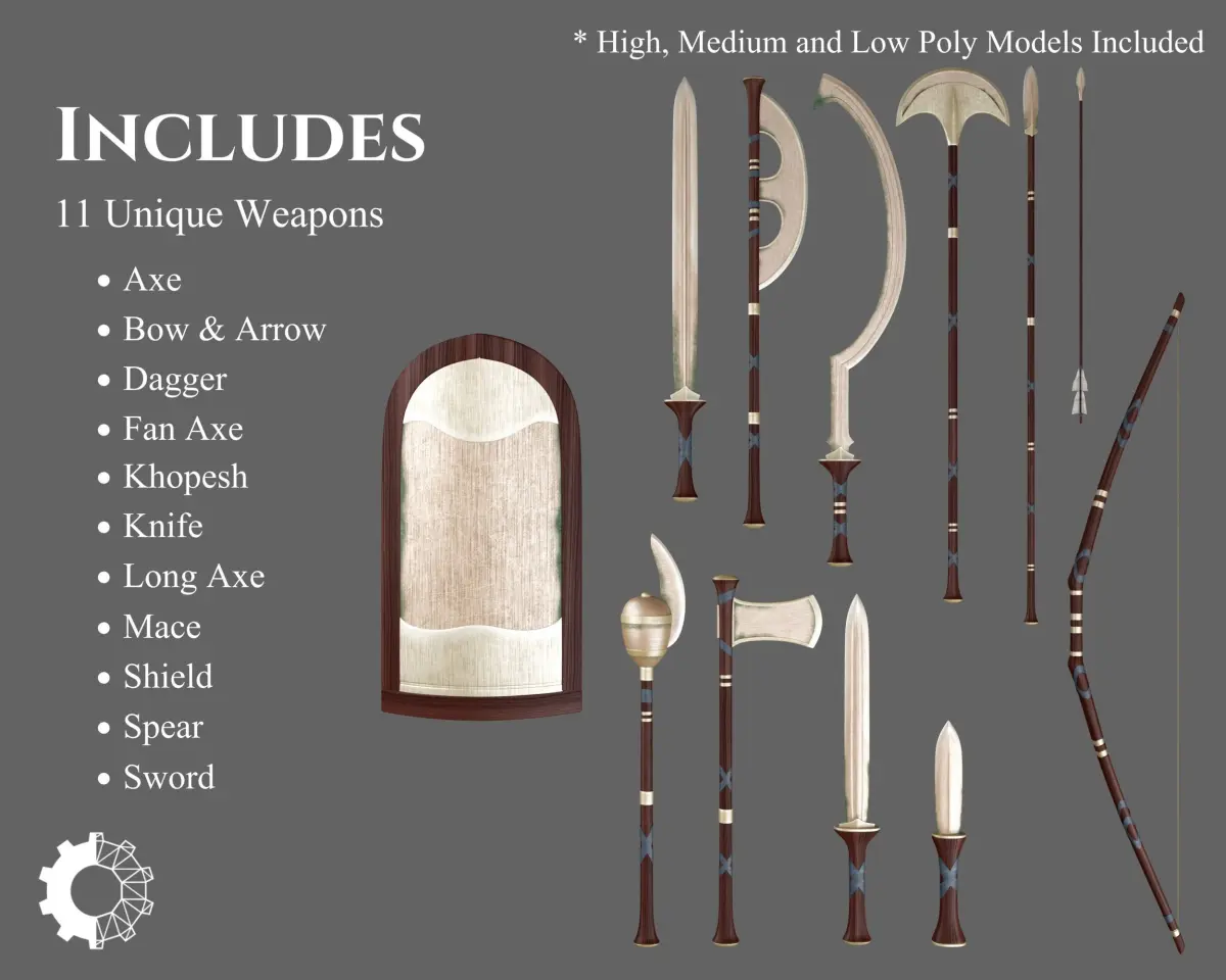 This Collection Set offers 11 unique Ancient weapons all in the same aesthetic Egyptian style. Each weapon includes 3 Polygon levels; High Poly, Medium Poly, and Low Poly. These models can be purchased separately. These models may be included in other collections for a different price.