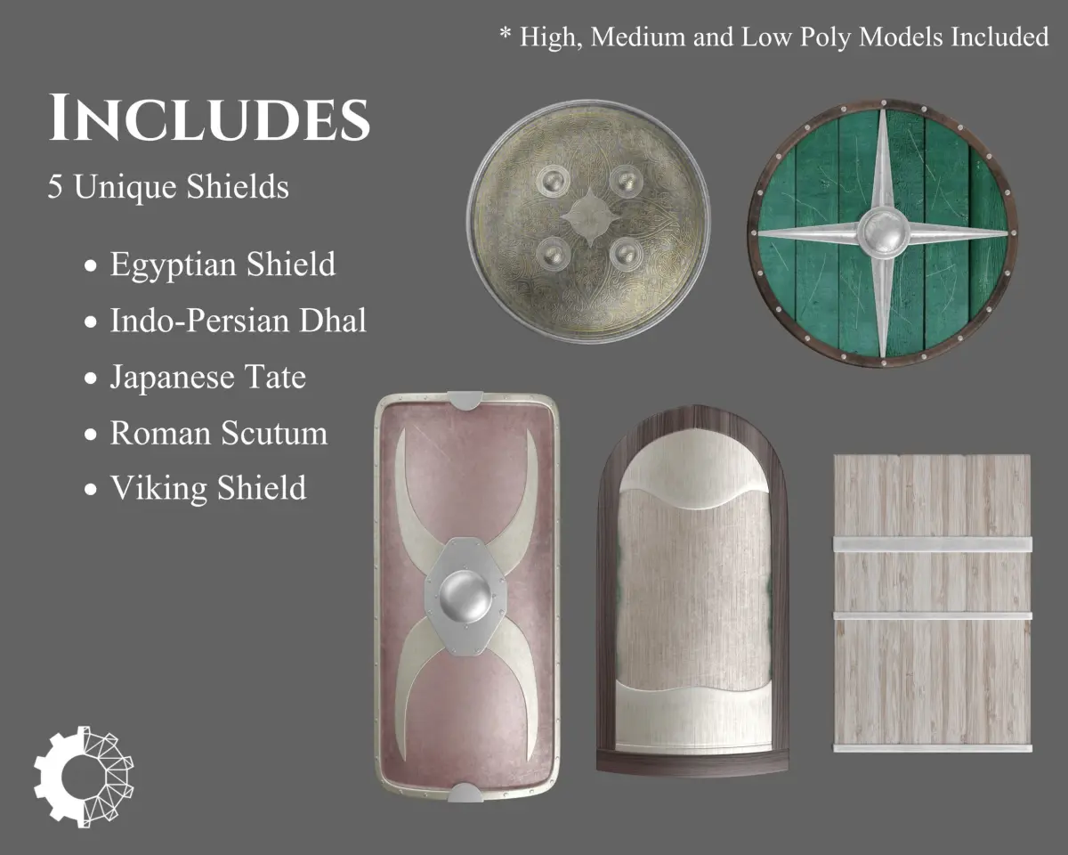 This Collection offers 5 unique Ancient shields. Includes the Egpytian Shield, Indo-Persian Dhal, Japanese Tate, Roman Scutum, and Viking Shield. These models can be purchased separately. These models may be included in other collections for a different price.