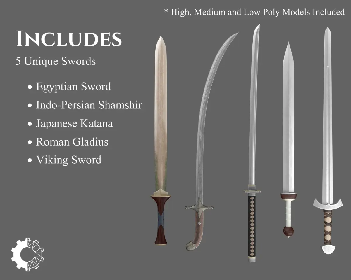 This Collection offers 5 unique Ancient swords. Includes the Egyptian Sword, Indo-Persian Shamshir, Japanese Katana, Roman Gladius, and Viking Sword. These models can be purchased separately. These models may be included in other collections for a different price.