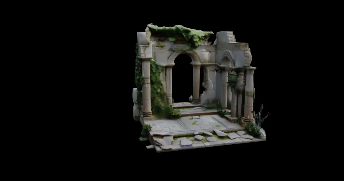 This 3D model captures the haunting beauty of a ruined ancient courtyard, where nature has begun reclaiming the remnants of a forgotten civilization. The structure features three grand arched doorways supported by partially broken Corinthian columns, all delicately weathered to evoke the passage of centuries. The stone walls and floor tiles are cracked and fragmented, scattered with debris and softened by the emergence of grass and moss.Intricately carved details are still visible on the lintels and pillars, suggesting the courtyard once belonged to a grand structure, possibly a temple or a noble’s residence. The use of realistic textures brings depth to the aged marble and cracked stone surfaces, while creeping vines and vegetation add a natural element that contrasts beautifully with the architectural decay. The floor reveals a subtle but elegant mosaic pattern that hints at its once-regal appearance.Perfect for use in fantasy, historical, or adventure game environments, this model offers a strong sense of story and atmosphere. The ruin evokes a blend of melancholy and mystique, making it ideal for settings that require an immersive, abandoned feel. Whether used in animation, rendering, or real-time environments, it contributes a rich visual narrative.The model is available for download in .gmb format, with textures included, ensuring a seamless setup in compatible software. It is also provided in .fbx format for broader compatibility across platforms and engines.