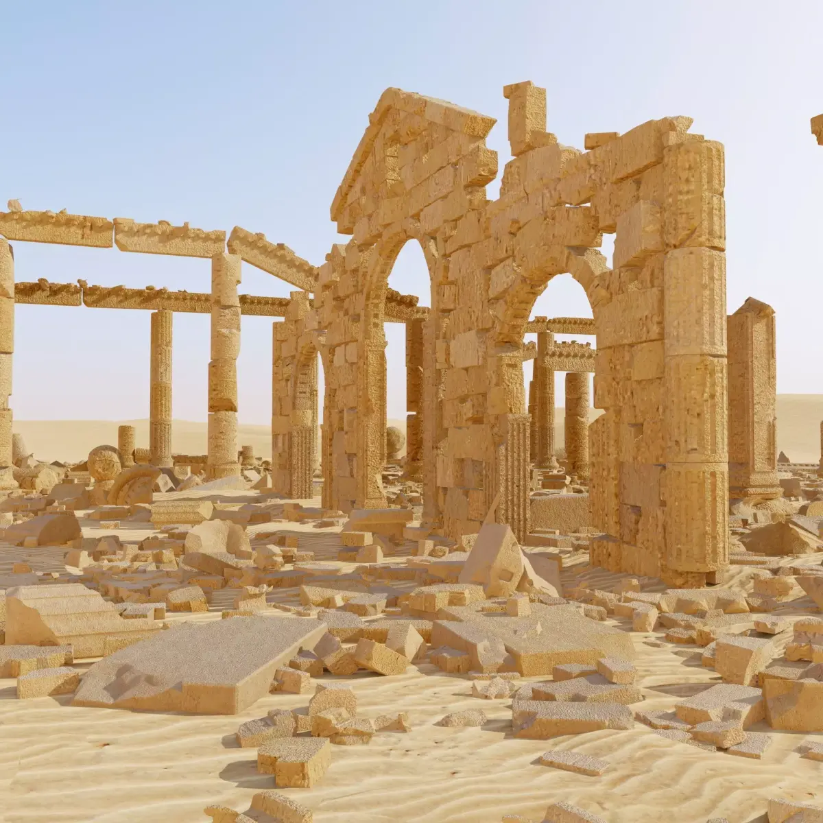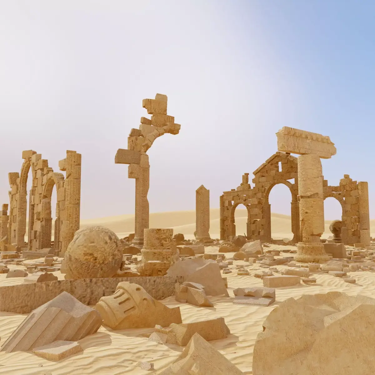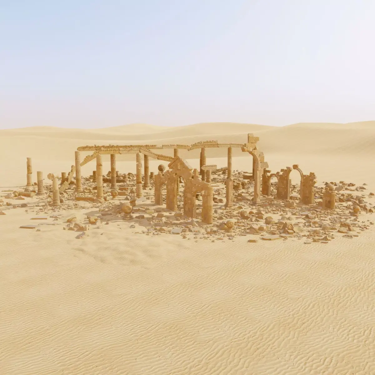Large-scale ancient stone ruins lost in a sandy desert. These are the remains of a monumental structure with classical archways, wall fragments, and crumbling light sandstone columns. Massive stone blocks, broken capitals, and round decorative elements are chaotically scattered around the building on textured sand dunes.