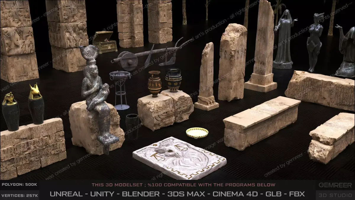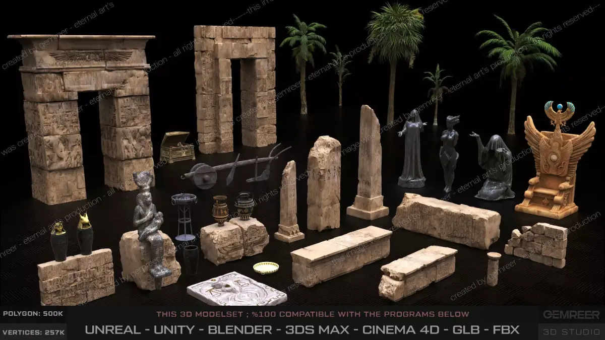 Unlock the gates of a civilization hidden beneath the sands. This pack brings together the ancient architecture of Ancient Egypt, mystic ritual objects, and oasis vegetation under a single modular roof. Inspired by deserts and abandoned ancient sites, this historical set will add an authentic soul to your projects.