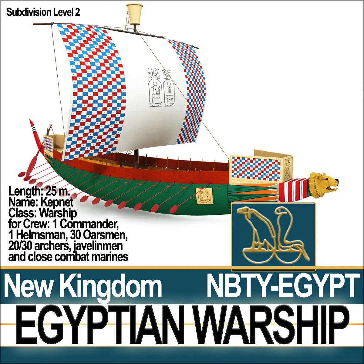 Ancient Egypt New Kingdom Warship Kepnet 25m galley. Faithful and accurate Reconstruction. C4D, 3DS, OBJ, VUE6to12!___________________________________________Ancient Egypt New Kingdom Warship Kepnet [or kebnet].Warship [lng: 25 m.; crew: 1 commander, 1 helmsman, 30 oarsmen, 20-30 archers, javelinmen and close combat marines]72 HD Textures, UVMaps and Alternate Textures.Real Model with complete real Sails Rigging and 30 working Oars.