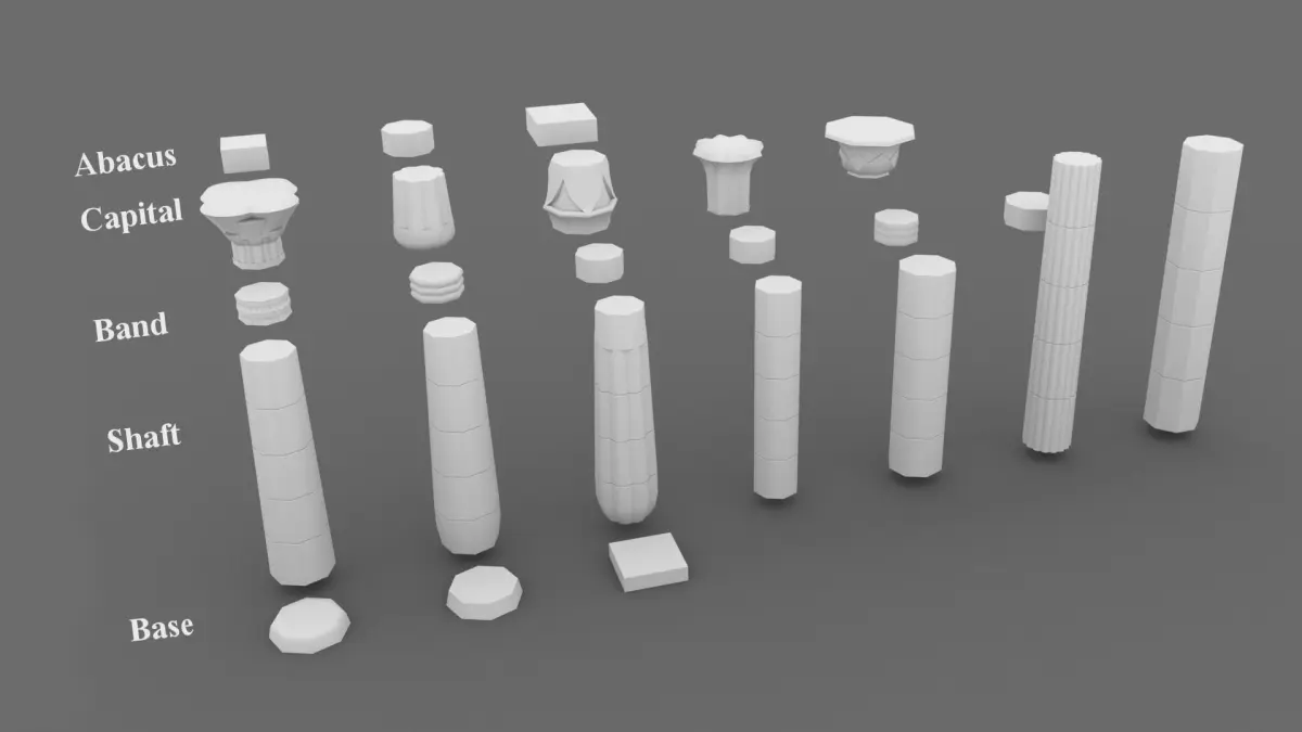 This column kit, based on ancient Egyptian architecture, contains 26 column pieces: 4 bases, 7 shafts, 6 bands, 6 capitals, and 3 abacuses. They can be combined to make more than 1000 unique Egyptian columns. The average column will usually contain about 500 vertices.