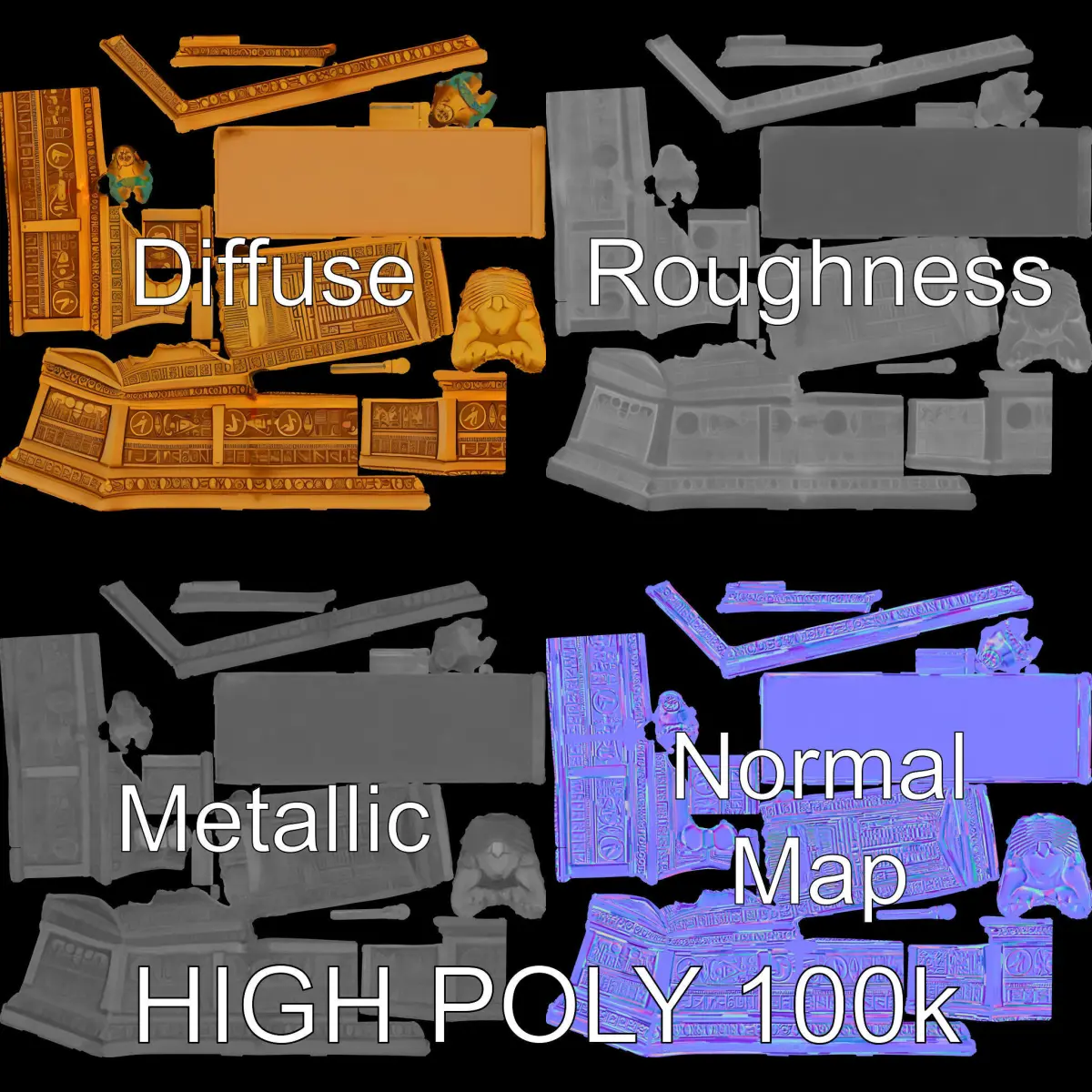 This Ancient Egyptian Sarcophagus Model Pack features three levels of detail suitable for various applications. Designed for high-quality production rendering and game engines, the models include low-poly, middle-poly, and high-poly versions. Textures are 4096x4096 PBR, Diffuse, NormalMap, and metallic, optimized for modern rendering engines and interactive presentations. The sarcophagus model is ideal for use in historical simulations, educational animations, or museum virtual tours. Accurately unwrapped with no overlapping UVs, it ensures excellent textural accuracy. The first image is the reference used for creating the 3D model. It is important to carefully evaluate the quality of the model by examining the preview images that display the topology and polygonal mesh. These previews (WIRE and WEB 3D Preview) clearly demonstrate how accurately the model matches the original reference and how well the geometry has been executed. Please like and leave a comment if you find this model useful.