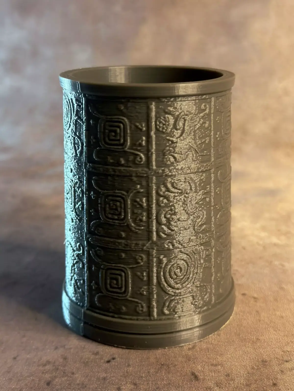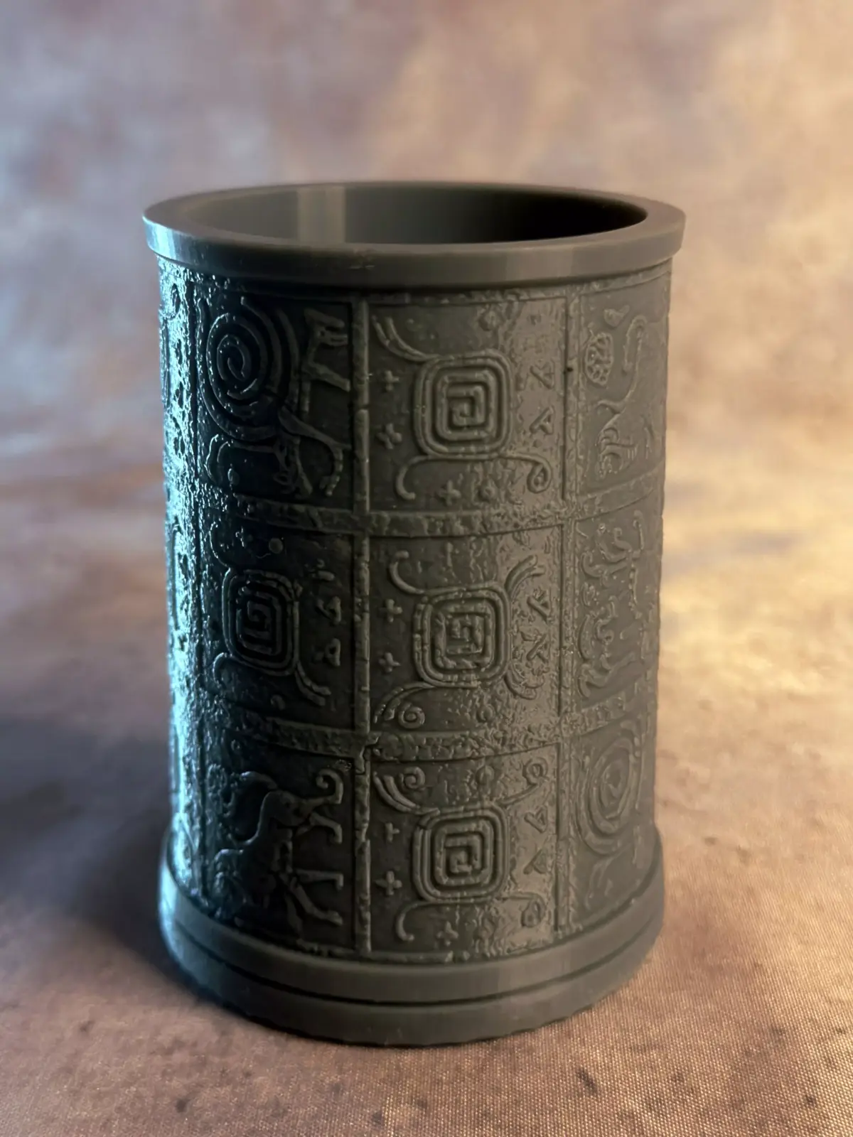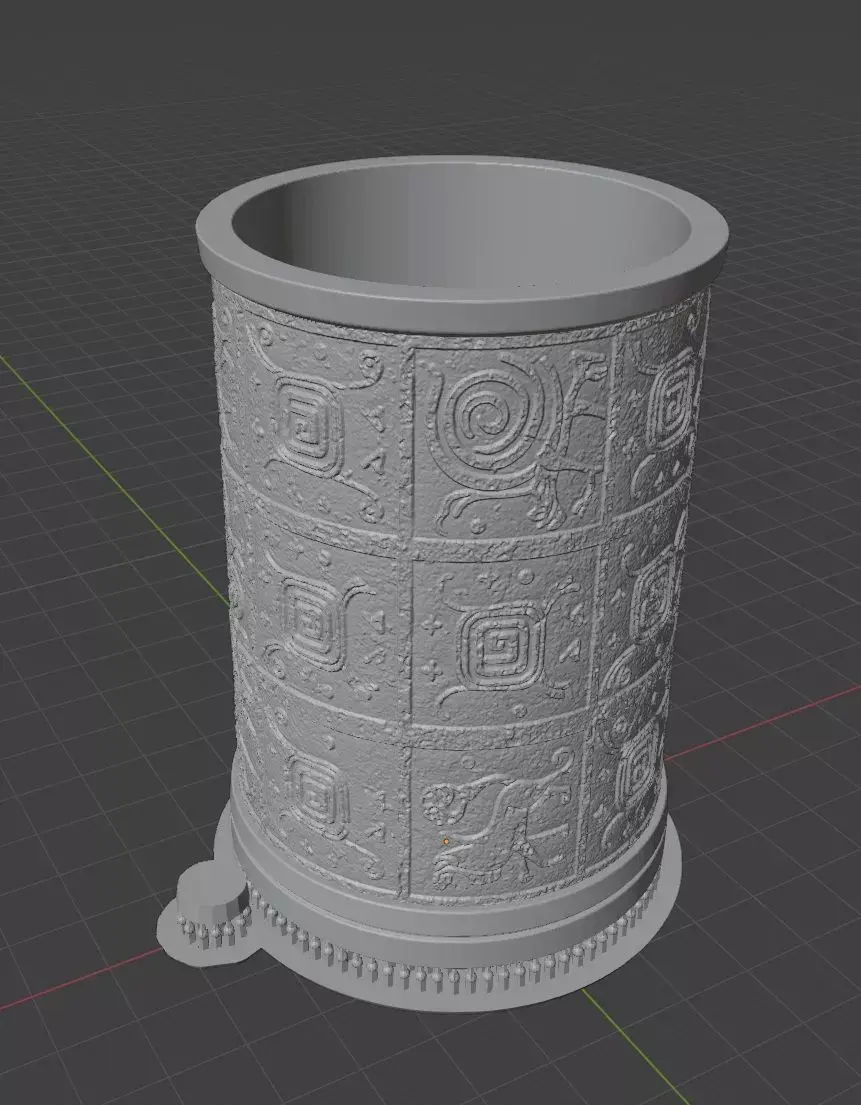 This pen holder showcases intricate, ancient-inspired geometric patterns etched into its surface, evoking Mayan or Aztec artistry for a striking, cultural accent on your desk.