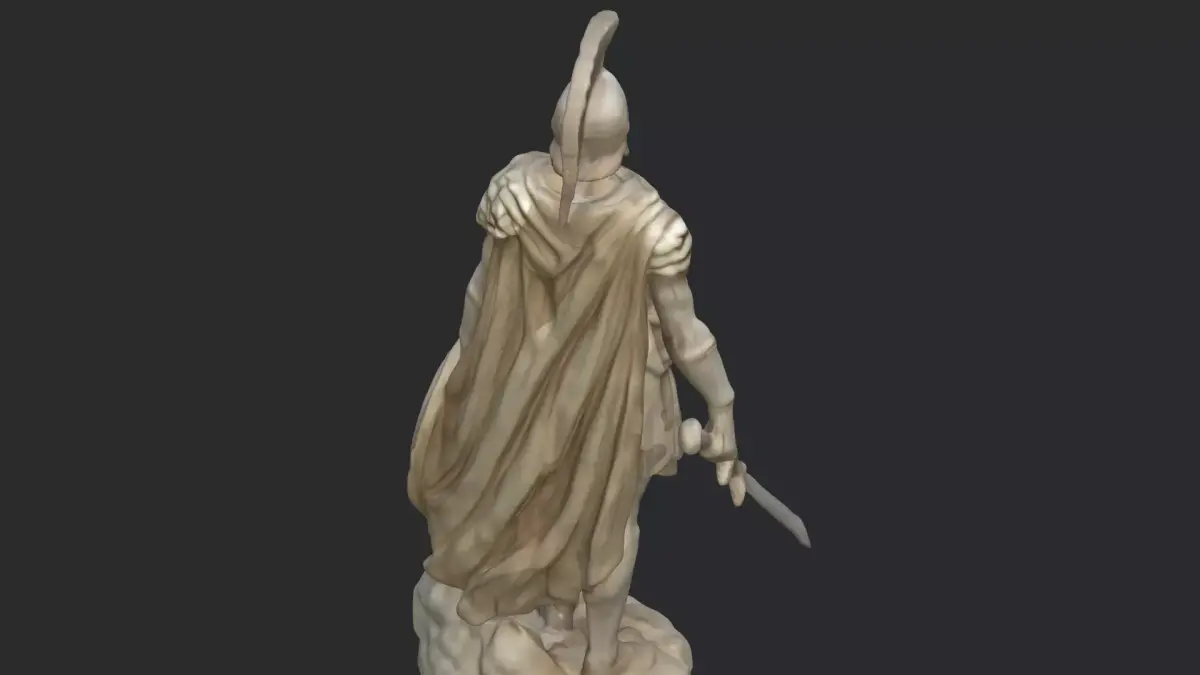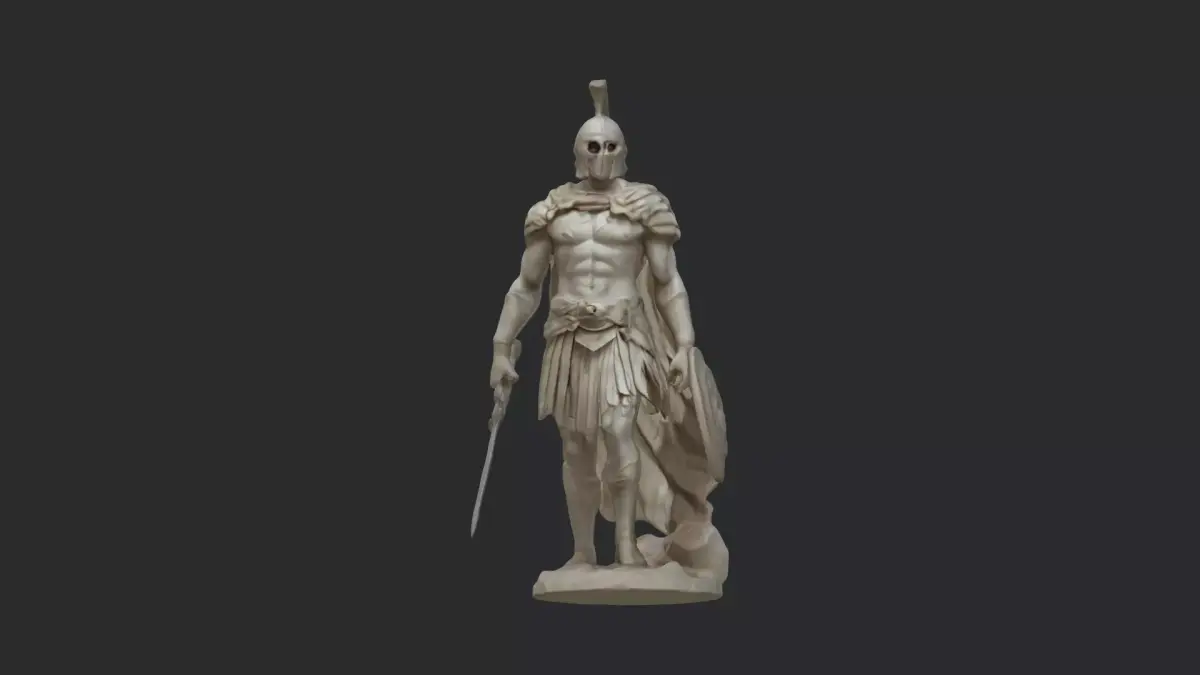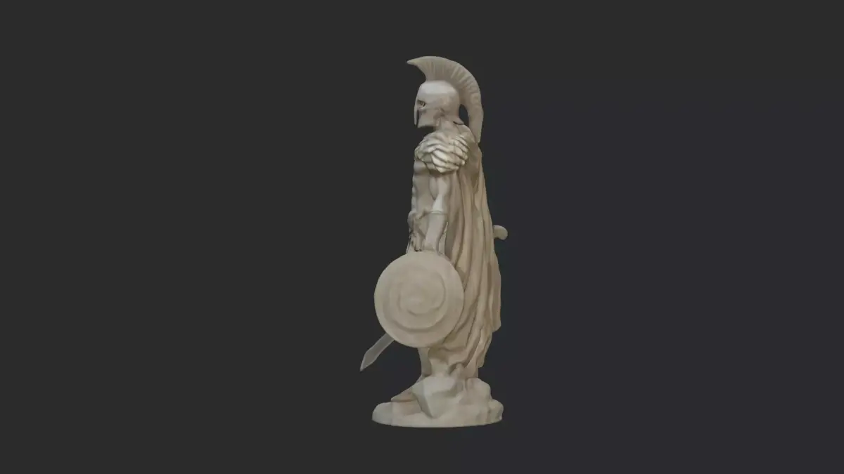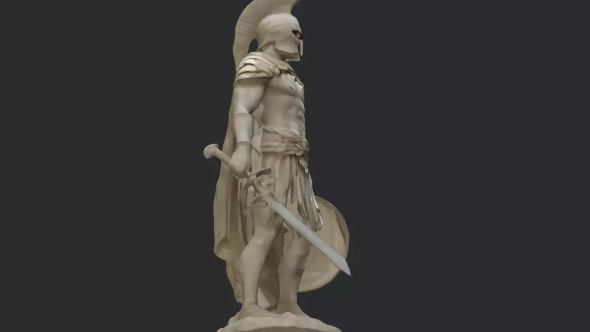 This highly detailed 3D model depicts a Spartan warrior/ancient gladiator hero in a commanding pose, complete with classical armor, plumed helmet, sword, shield, and a rugged rocky base. Designed with realistic muscular anatomy and finely sculpted details, this model captures the spirit of ancient warriors and legendary battles.