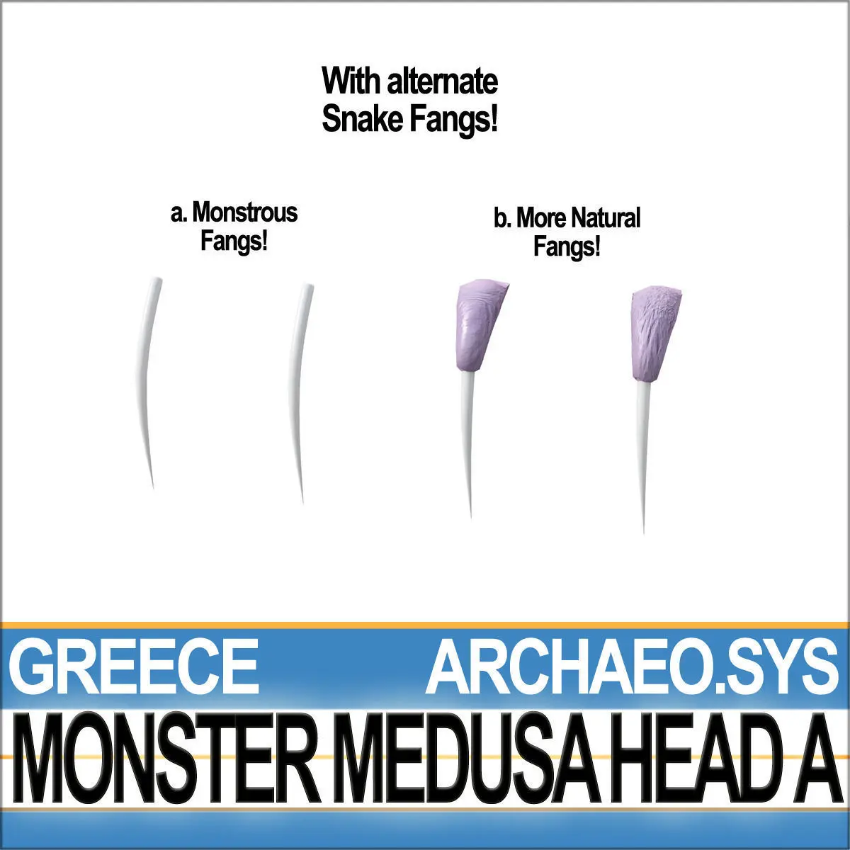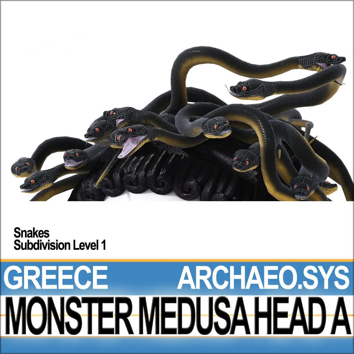 Ancient Greek Monster Medusa Head A, Character with 18 Snakes and TPose Snake SL0 Master Model. 19 HD Textures with 2 Unwrapped UV Maps. Faithful Reconstruction. C4D, 3DS, OBJ, OBJ for Poser/Daz, VUE6to12!___________________________________________Ancient Greek Monster Medusa Head A. The original Ancient Greek design and colours from 6th century BC.With Hi-Detailed Subdivision Level 0 [SL0] Snake Models ready for Subdivision Systems-C4D HyperNurbs.2 UV Unwrapped Maps. 19 textures.With also obj version already in Poser Unit, for Poser-Daz Import!With all purpose easy editable SL0 Snake model!Create your own project, Low-Poly or High Definition, just by editing the Snake Master Model in T-Pose!