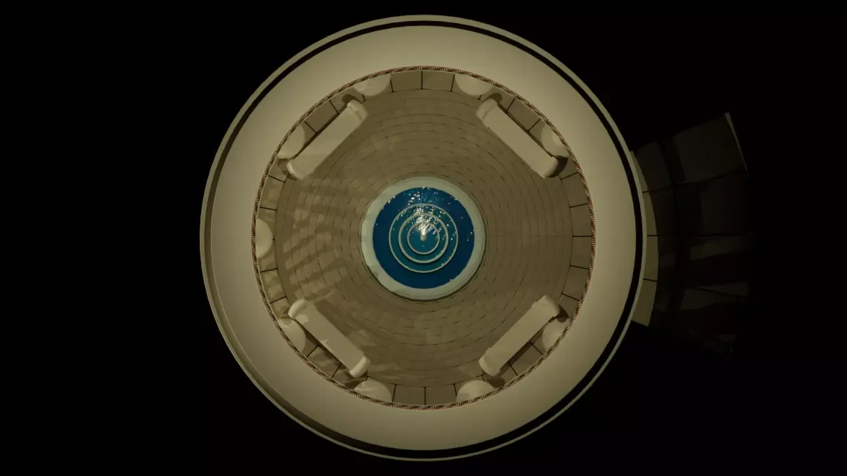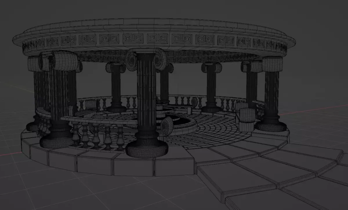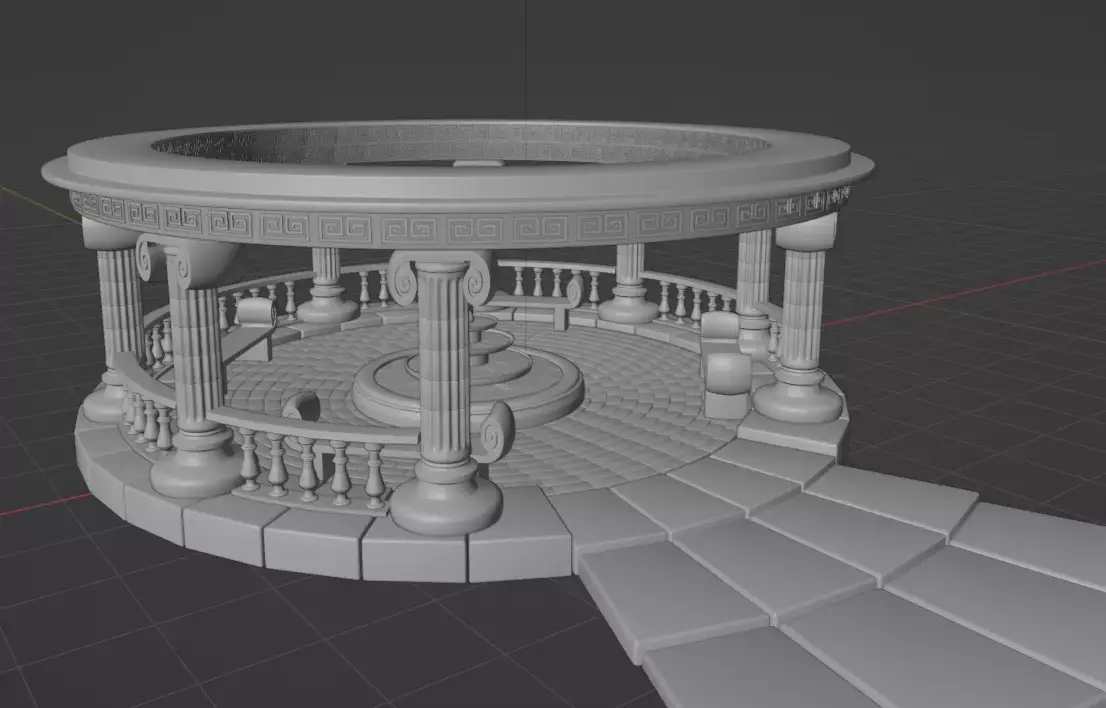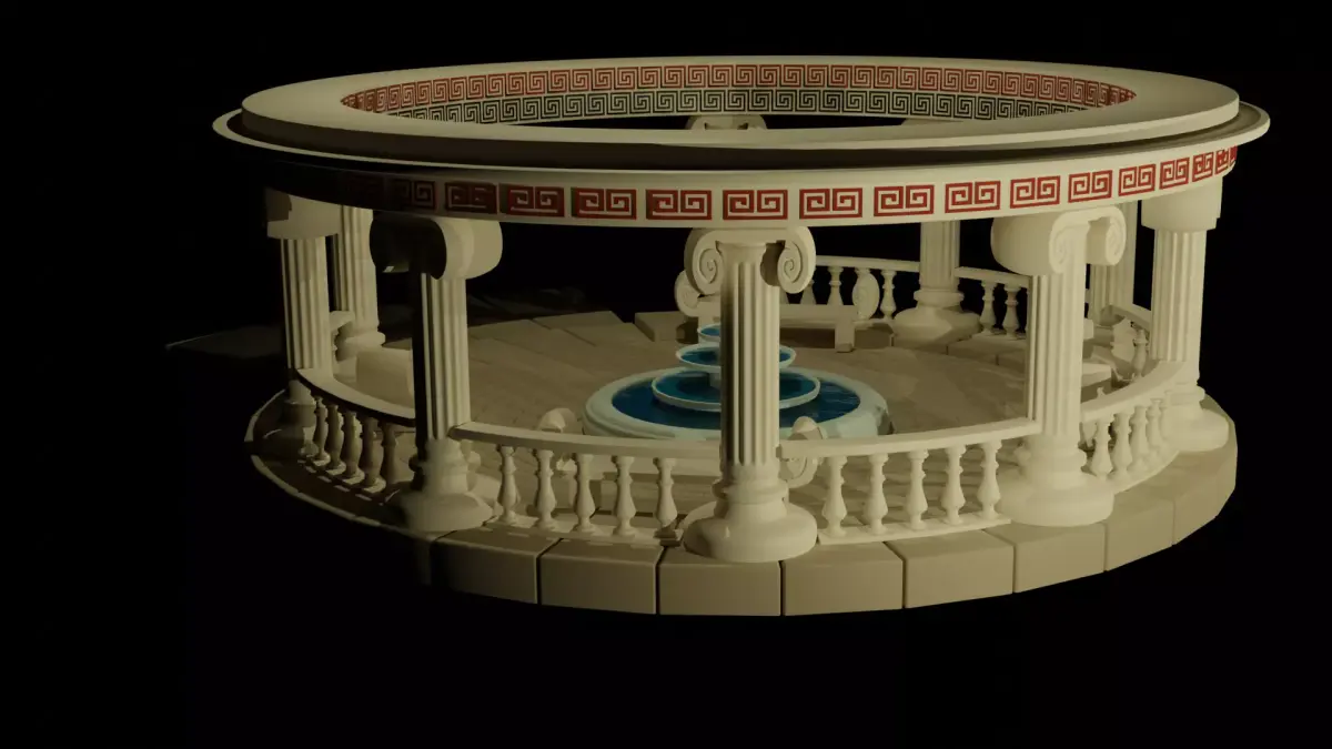 A beautiful, stylized 3D model of an Ancient Greek-style rotunda. This architectural asset features elegant Ionic columns, a central three-tier fountain, and classic Greek fret (meander) ornaments. It includes stone benches and decorative railings, perfect for park environments or historical scenes.