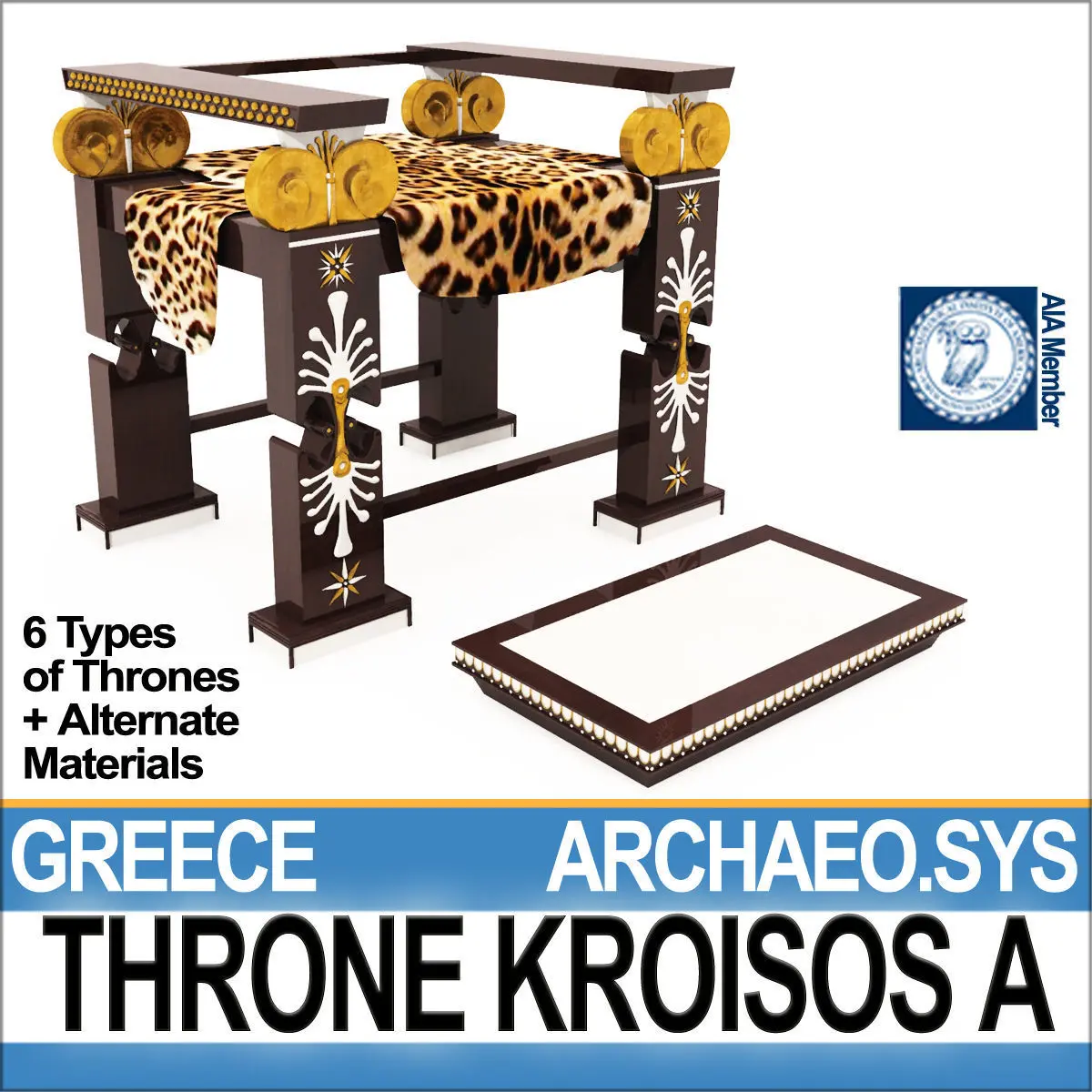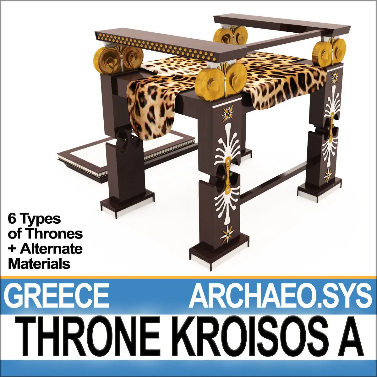 In the package you will find:1- Throne Kroisos A, in typical chrysoelephantine materials;2- Throne Kroisos B, in typical chrysoelephantine materials;3- Throne Kroisos C, in typical chrysoelephantine materials;4- Backrest for Throne A and B;5- Backrest for Throne C;6- 32 Hi-Quality Hi-Def PhotoReal Textures [4096x4096; 600x1600; 1024x1024; 900x900; etc.];7- Alternate Textures to create different types of elements;8- Real World Scale SmartCgArt Man Reference System with models [C4D, VUE, 3DS, OBJ, DXF].
