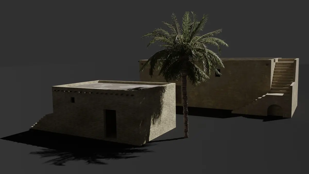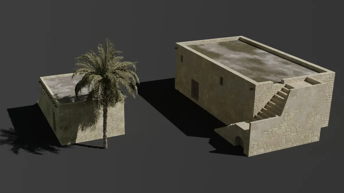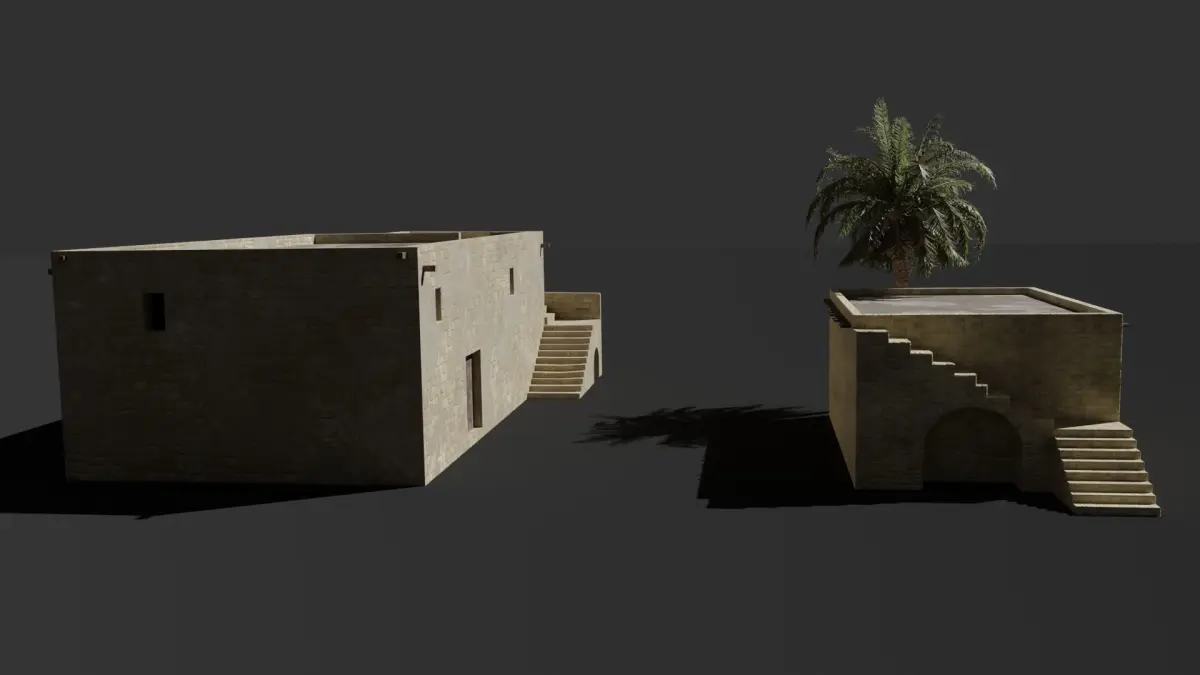 Realistic Ancient Judean set of houses - Time of Jesus, in the style of Jerusalem small house architecture -Countains the two houses seen in the pics-the buildings are low/mid poly-Realistic Palm Tree included as well-PBR shader-Works with Blender Cycles
