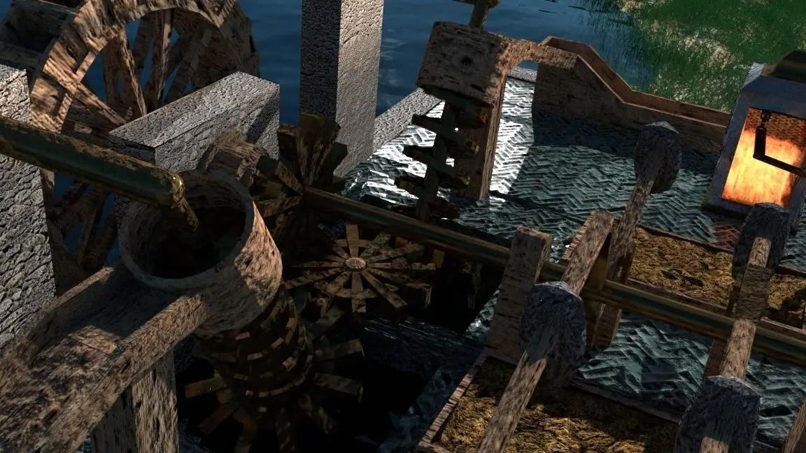 This multi-level and multi-purpose Ancient Hydraulic machine, specifically for working blacksmiths, converts Kinetic and Gravitational potential energy of running water into rotational power, later operating into cams, pistons, cogs, shafts, chain drives, Archimedes-screws, bellows & cranks from a single origin. My concept depicts the roots of the Industrial Revolution were centuries earlier than anticipated, adhering to the typology and technology of both Medieval Chinese works but also those similarly of the Medieval Near East (see works of Al Jazari). The Archimedes screw potentially shows elements of cultural transfer of Ancient Greek ideas towards the East (however could be independent evolutionism and not diffusion). Automatic bellows are included in my design attached to cranks allowing for high temperatures needed within the blast furnace for the smelting of iron (in effect a steam engine in reverse). In addition water is extracted for the cooling of metal alloys (or irrigation systems/livestock sustenance) from the rotating Archimedes-screw controlled and flows to differing heights. Rotating mill-stones crush the wheat and hammers sculpt with great force the still pliable metal instruments to shape (in addition to grain), both operated along a cam shaft and are all entirely operated from one point of hydraulic origin from the main water-mill.