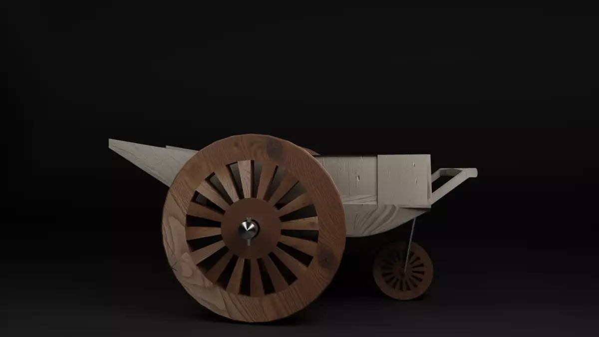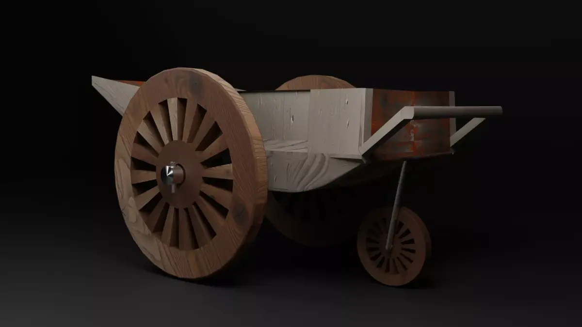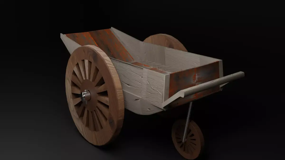 This is a highly detailed 3D model of a medieval-style wooden cart, featuring weathered wood grains and rusted metal parts. It is ideal for historical reenactments, village environments, or farm scenes.