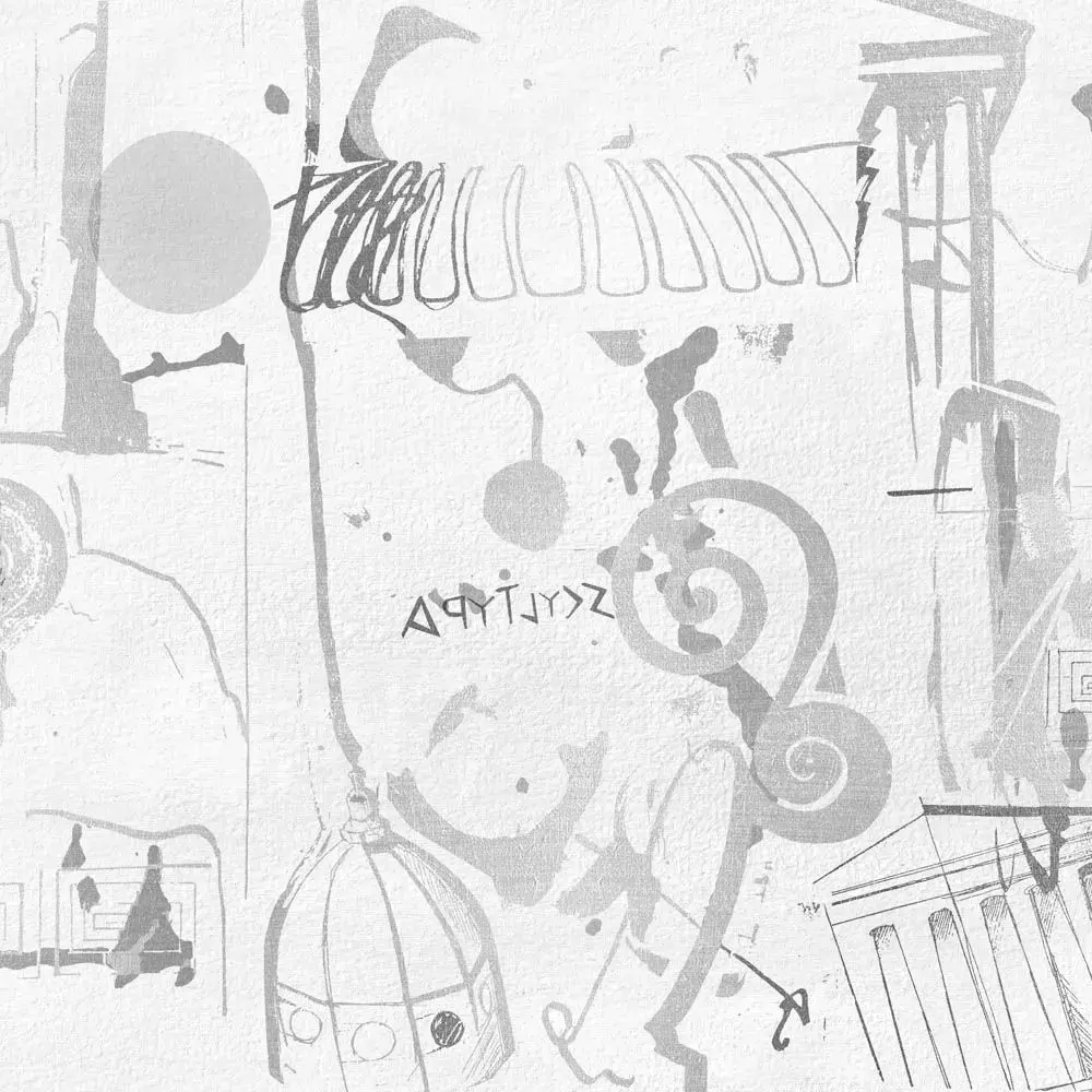 An expressive collage of hand‑drawn columns, domes, spirals, and cipher‑like marks evokes museum sketches and excavation notes, layered over a tactile plaster ground for a cultured statement wall in living rooms, cafes, and boutique hotels . Broad brush traces and fine line etching create depth without clutter, while the oversized composition reads elegantly from near and far in contemporary or eclectic interiors . Supplied in two palettes—Emerald with antiqued gold accents and Chalk Limestone greys—each version is optimized for seamless extra‑wide panel tiling and premium large‑format printing or CGI staging, with a lifestyle preview showing proportion behind modular seating .