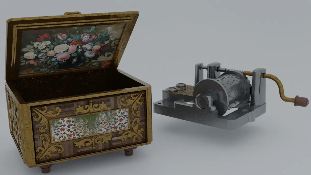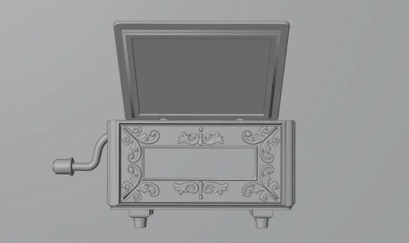 This 3D model includes - a music box, machinery and its receptacle.This 3D model does not include - the decorations other than the box.