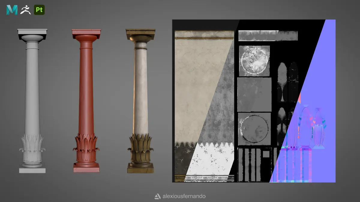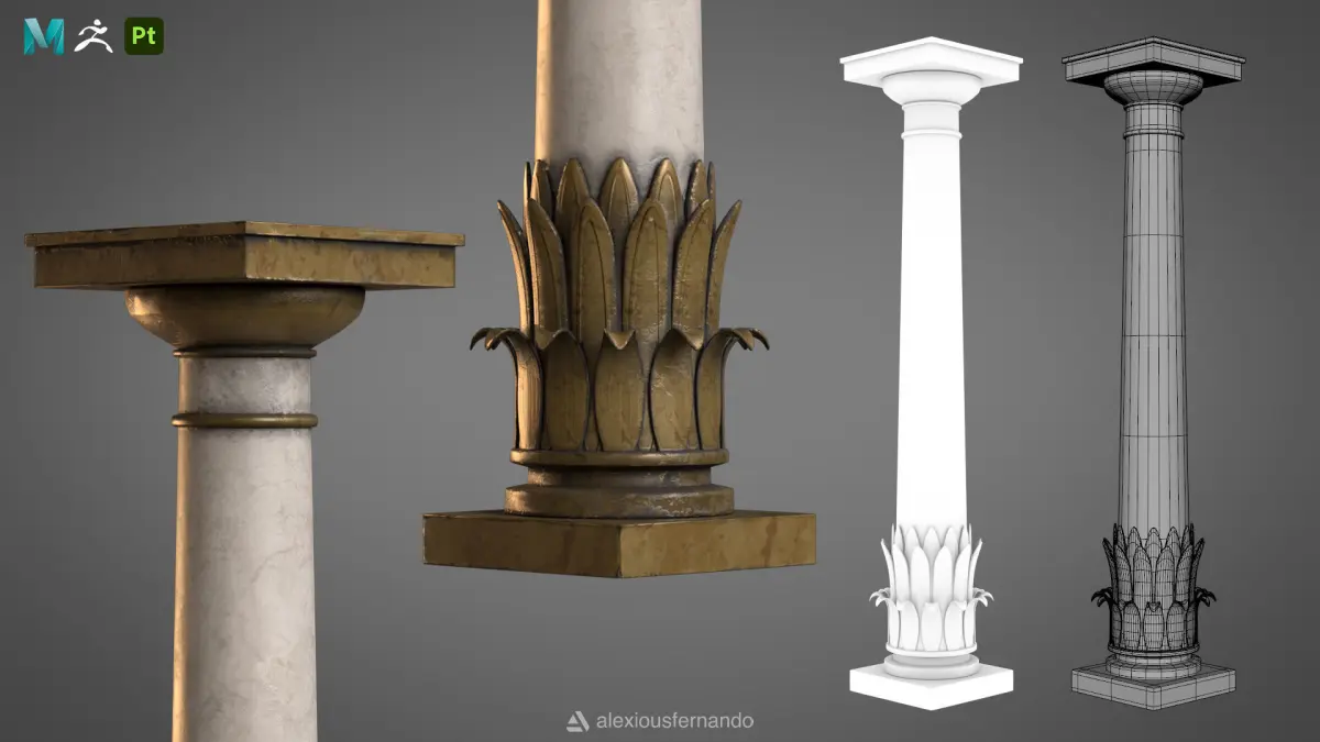 Ancient Pillar: Base modeled in Autodesk Maya, sculpted in ZBrush, textured in Substance Painter.