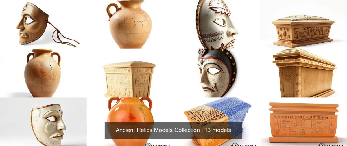 Dive into a world of history and culture with this meticulously crafted collection of 3D models inspired by ancient civilizations. Perfect for historical, archaeological, and storytelling scenes, these models provide a window into the rituals and aesthetics of the past. Highlights include: an amphora with a curved handle and intricate patterns; a deity statuette with a smooth surface and detailed design; a mysterious ceremonial mask with carved textures; and a hieroglyphic-embellished sarcophagus ideal for Egyptian-themed narratives. Each model is intricately designed with natural colors and textures to enhance your creative projects.