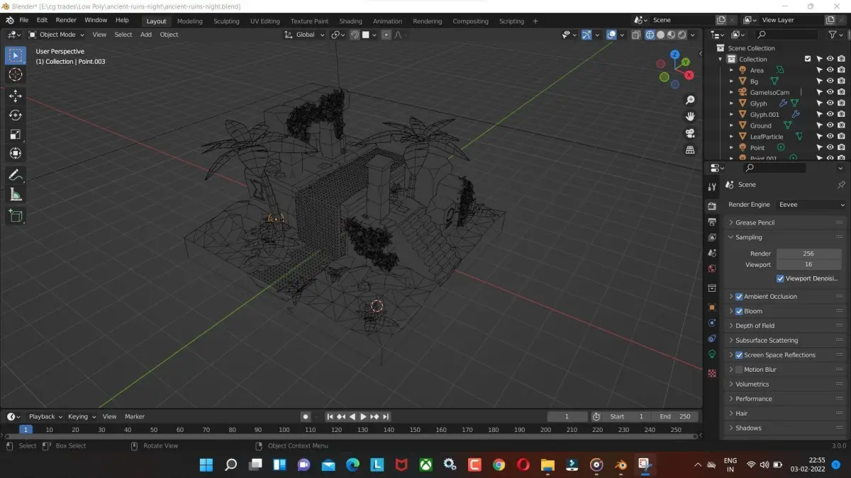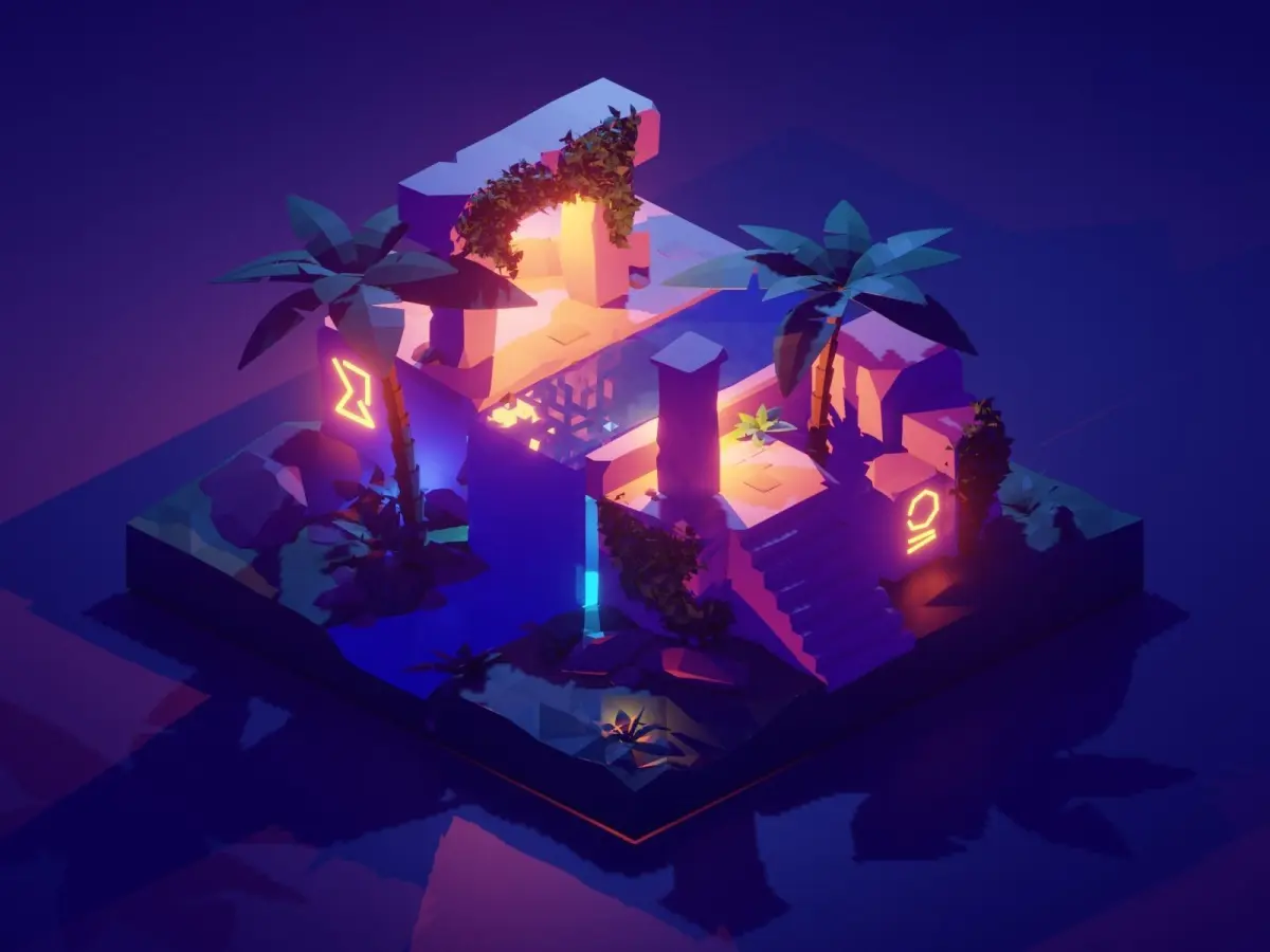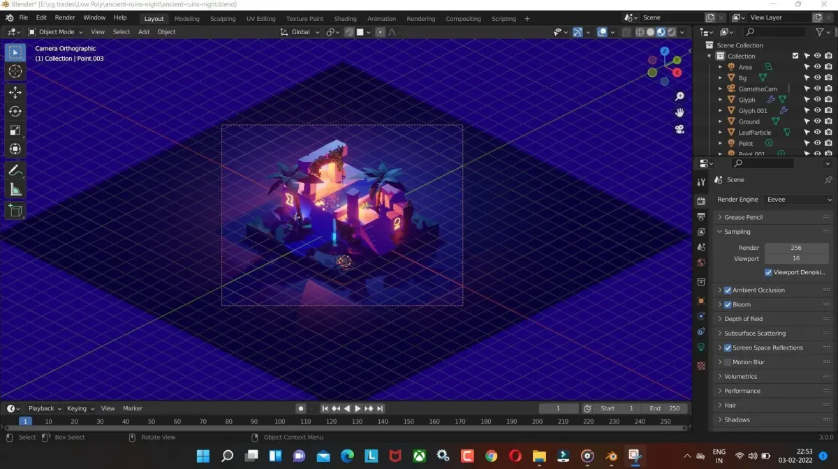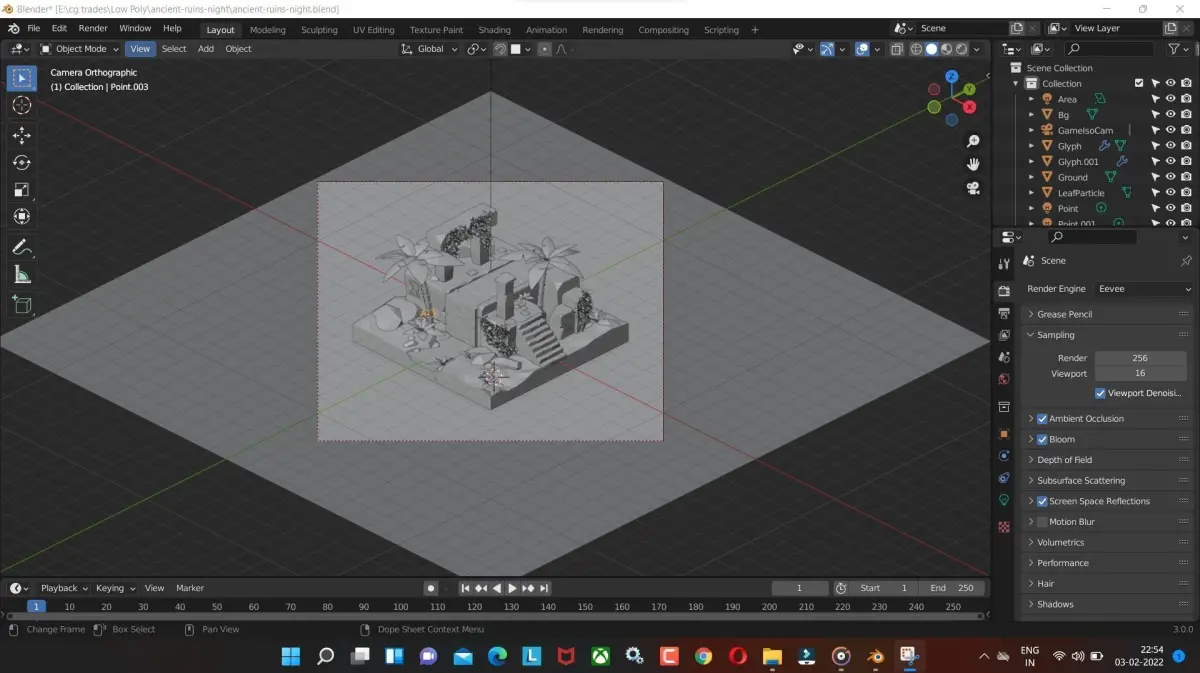 Ancient-ruins-night Tree with water and old temple low poly model Render in Blender