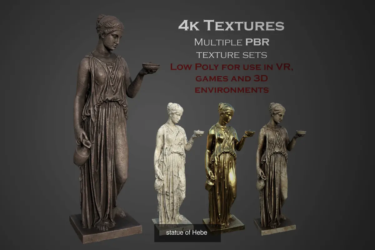 a collection of statues and busts from Ancient Civilizations for use in AR, Arch Viz, and Games consists of 50 statues of Venus, Cupid, psyche, Hebe, dancing girl, Antinous Mondragone, portrait of Michelangelo, portrait of Nicolas Coustou, a statue of Aphrodite, and miscellaneous statues...