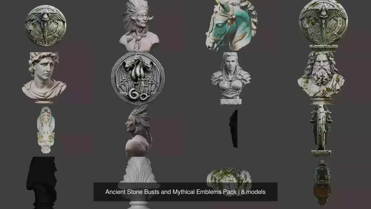 Artistically, every piece emphasizes strong silhouettes and readable forms, ensuring clarity when used as icons, UI elements, or decorative assets. The weathered stone material treatment adds realism and atmosphere, allowing these assets to seamlessly integrate into ancient ruins, temples, museums, fantasy cities, or historical settings. The consistent visual language across busts and emblems makes this pack suitable as a unified asset set for professional projects.