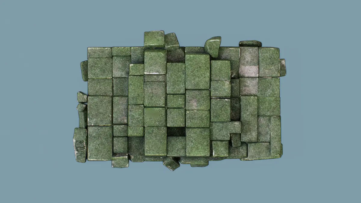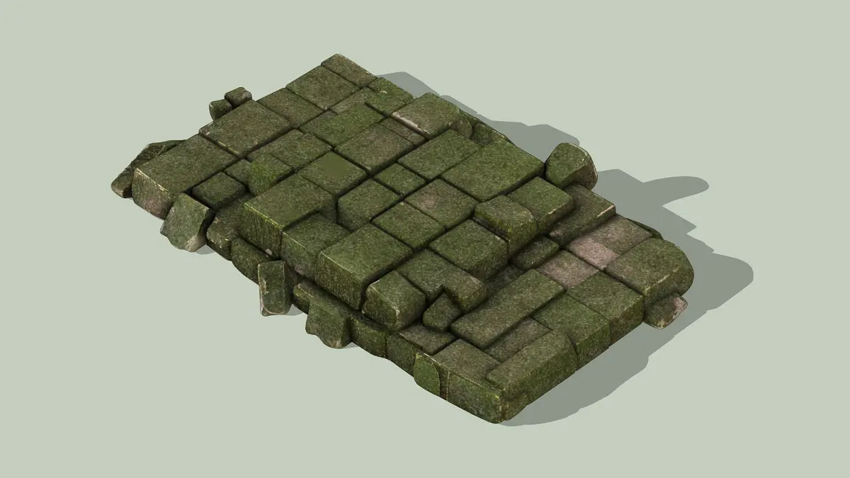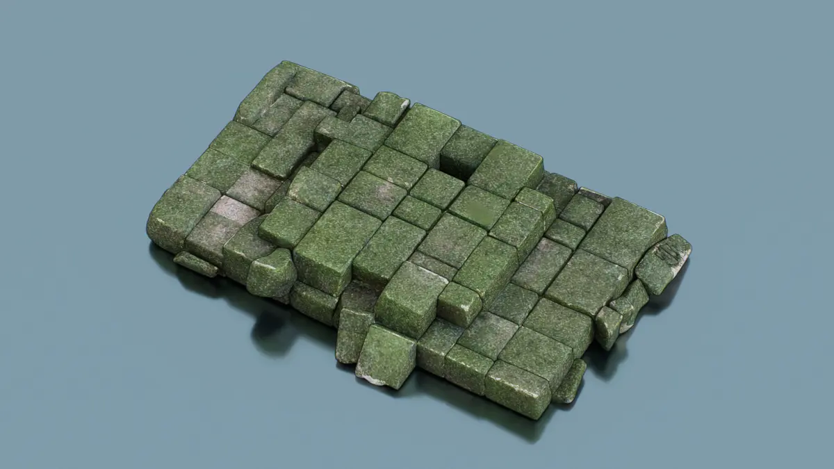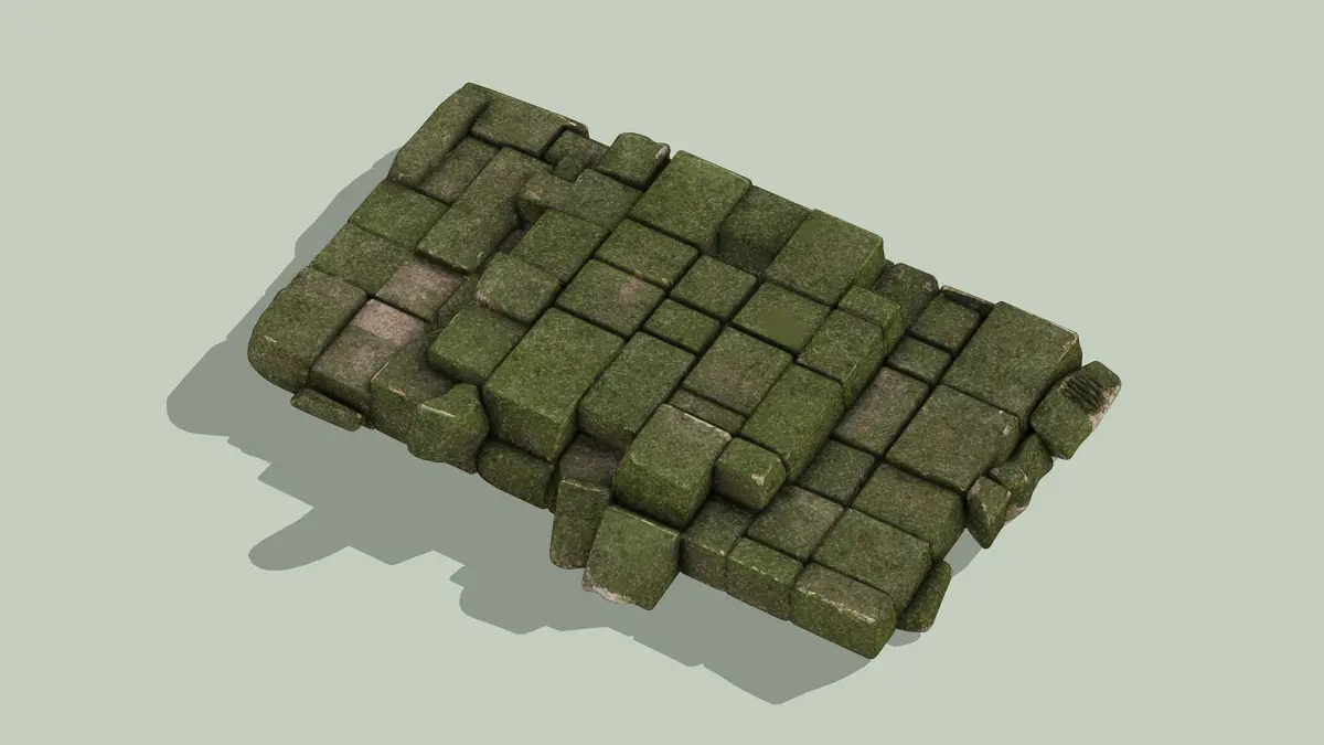 This 3D low-poly model portrays an ancient stone platform, its surface crafted from a grid of small, cube-shaped blocks that lend it a distinctive mosaic-like appearance. The muted, mossy green color, interspersed with patches of gray and brown, evokes the image of a structure long exposed to nature’s elements, while the uneven arrangement of blocks—some missing, others broken—enhances its dilapidated and timeworn character. Jagged edges and protruding stones contribute to its rugged, weathered charm, making it an ideal asset for digital scenes that call for a sense of history, decay, or mystery, such as video games or animations.