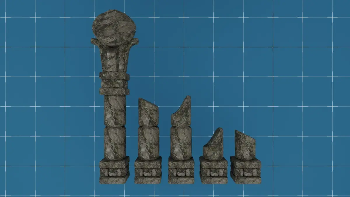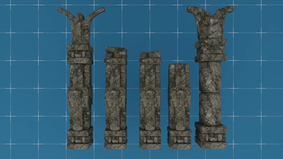 Asset pack of modular environmental props of a Medieval/Ancient Stone Ruins Columns & Walls.(20) different colums and walls models and (16) model elements from which you can build your own ruin models.Zip file contain:Geometry:.fbx, .obj, .glb and .x3d file formats and also a .blend fileTextures: There is one Texture map for all meshes.Texture maps in 3 resolutions : 1024x1024, 2048x2048, 4096x4096.[*Base_ Color * Roughness map * Normal/Bump map * AO map]
